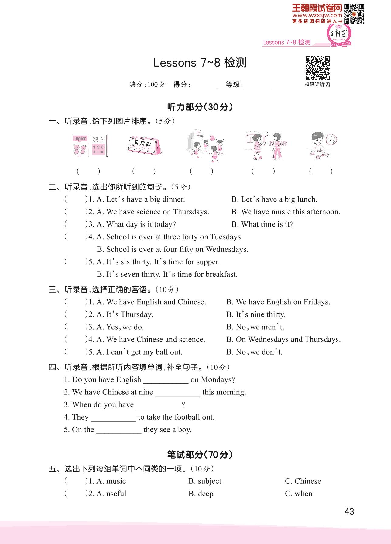 2023下册五年级英语科普版 Lessons 7~8 检测