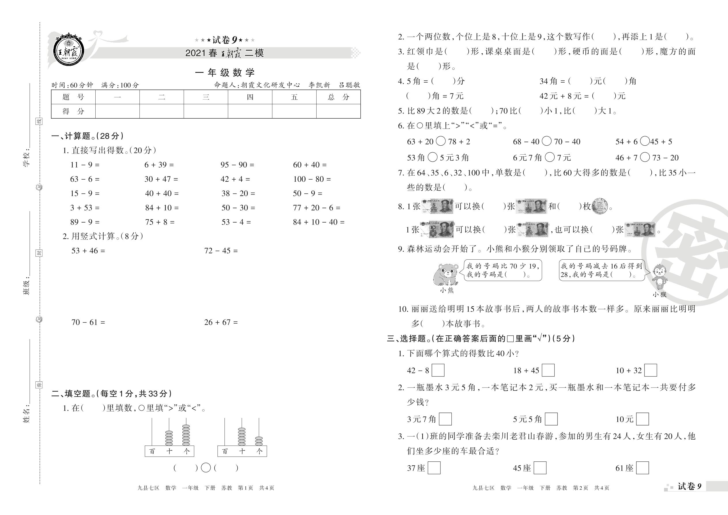 王朝霞期末模拟卷一年级下册数学(苏教版)_R210802205653【9】
