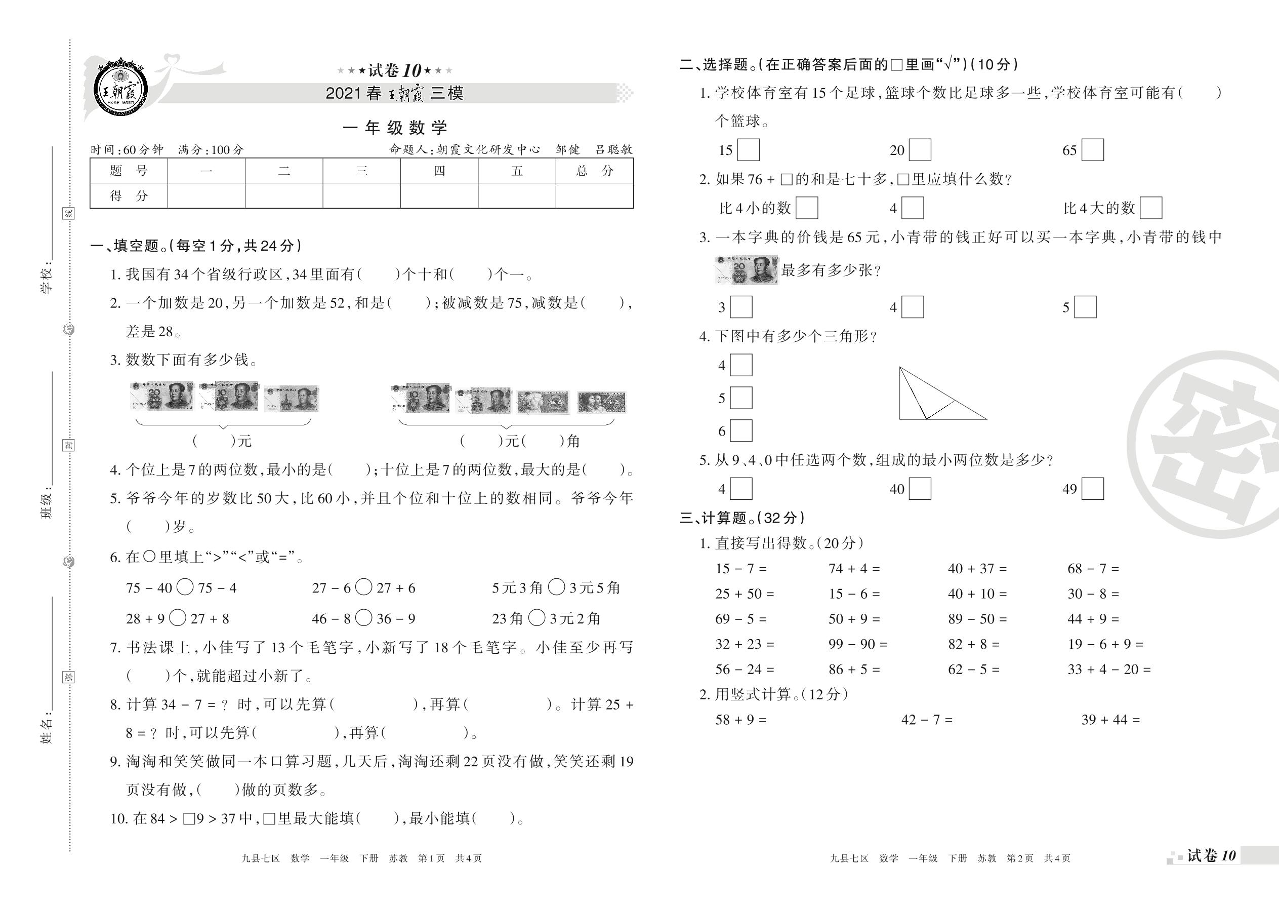 王朝霞期末模拟卷一年级下册数学(苏教版)_R210802205655【10】
