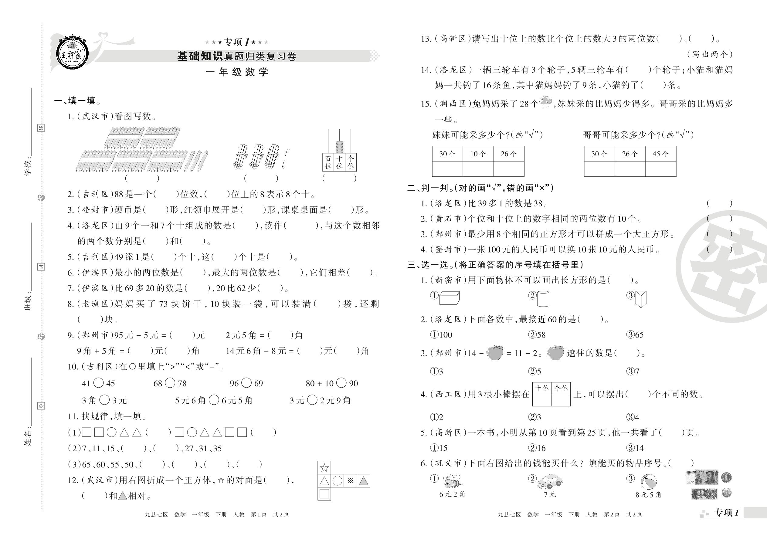 王朝霞期末专项卷——基础知识、计算真题归类复习一年级下册数学(人教版)_R210802205710【0】