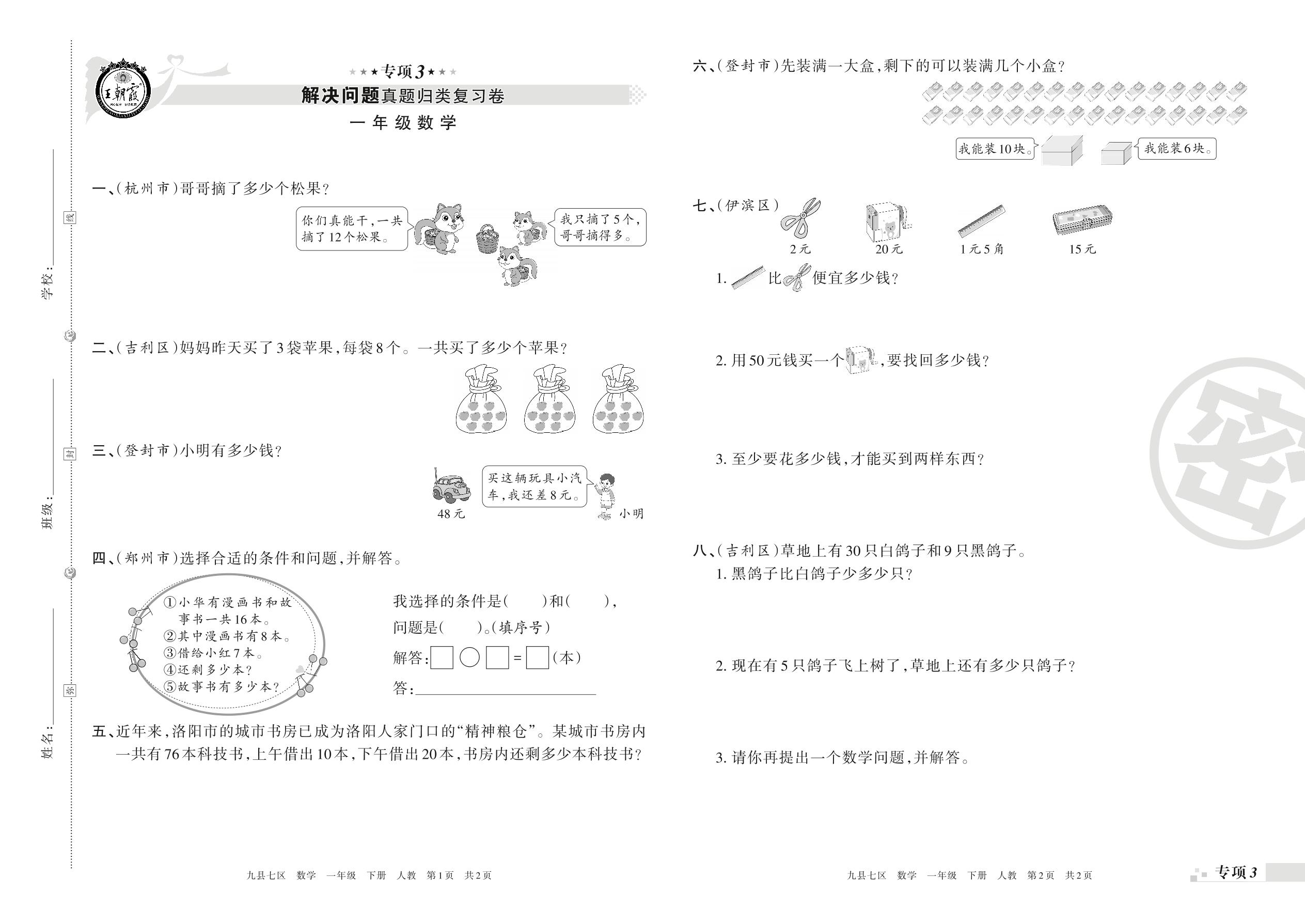 王朝霞期末专项卷——解决问题真题归类复习、新颖题速递:生活与数学一年级下册数学(人教版)_R210802205714【0】