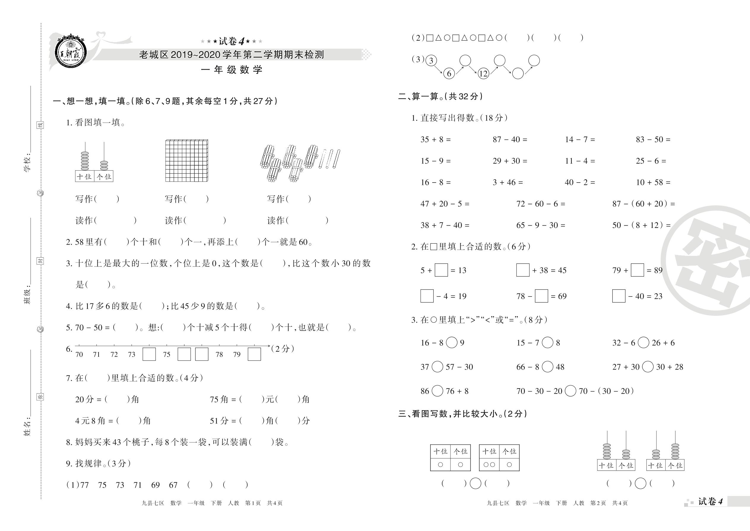 2019-2020学年第二学期洛阳市老城区一年级数学试卷(人教版)【4】