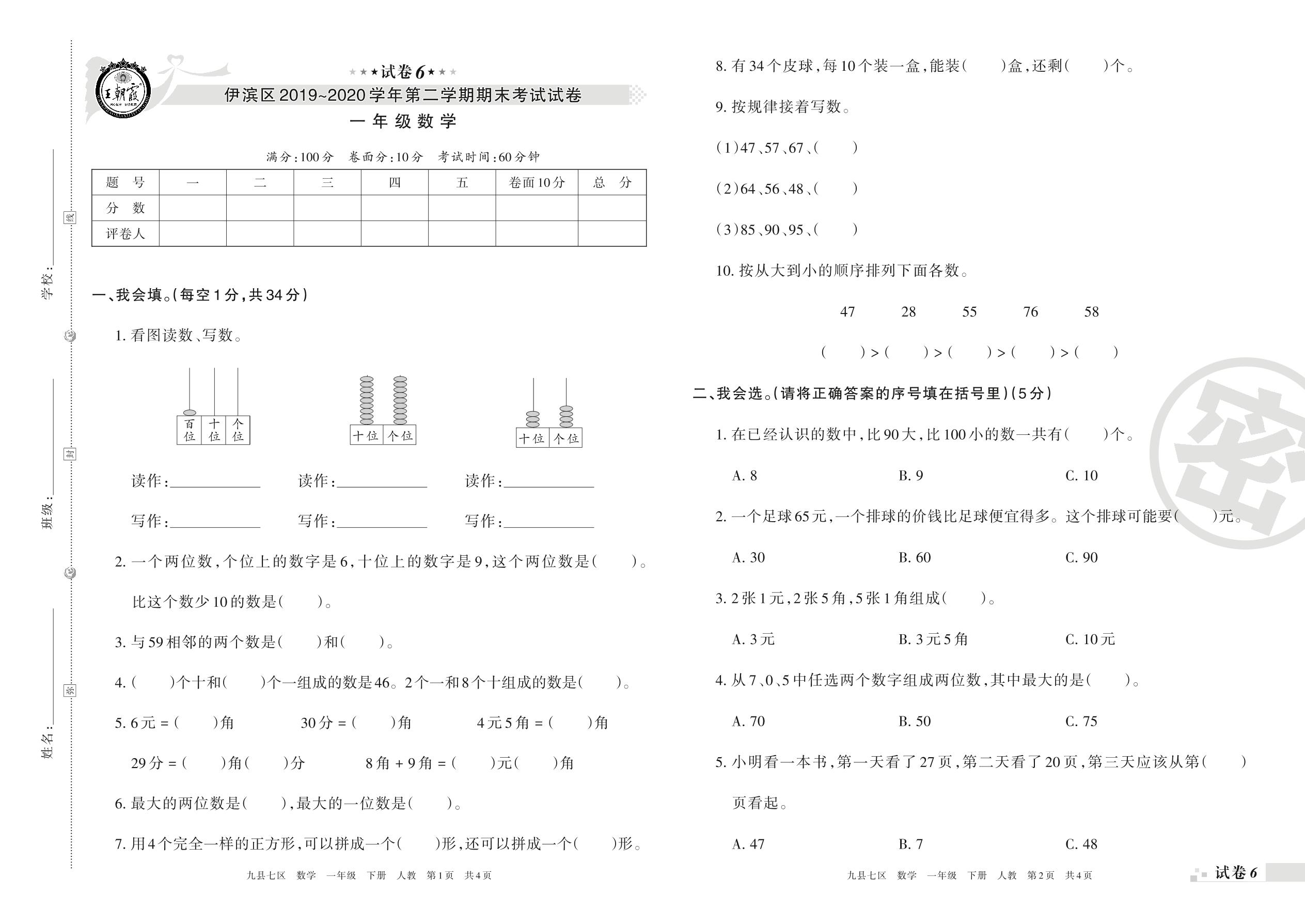 2019-2020学年第二学期洛阳市伊滨区一年级数学试卷(人教版)【6】