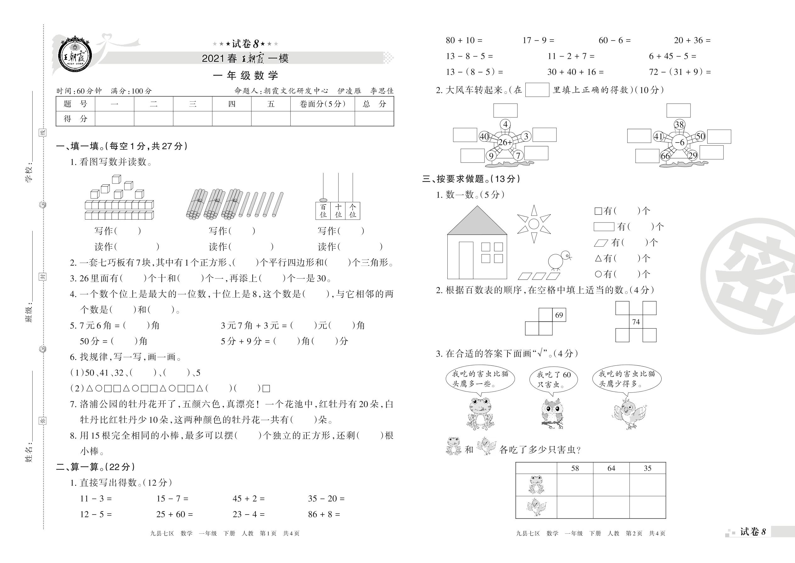 王朝霞期末模拟卷一年级下册数学(人教版)_R210802205751【8】
