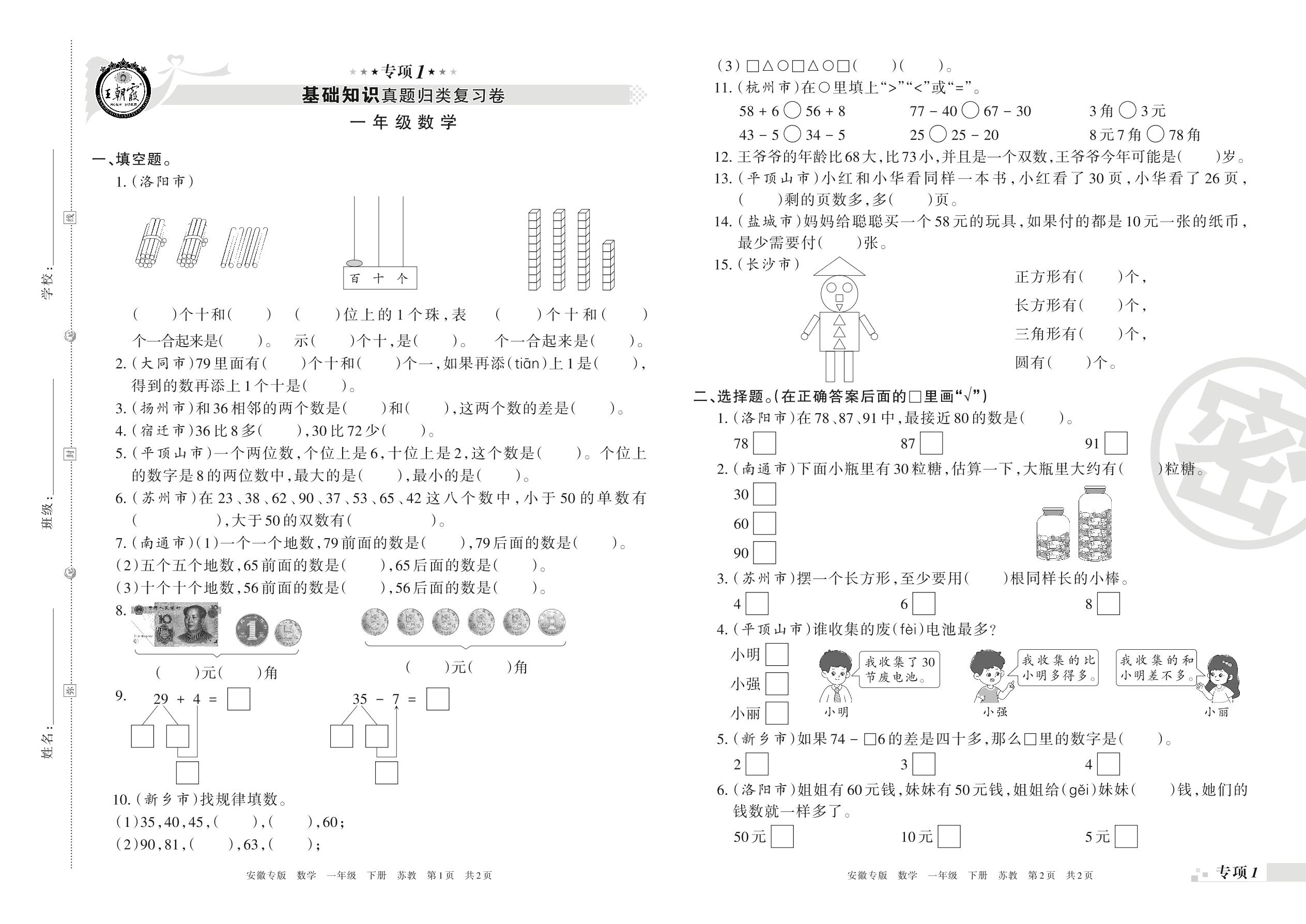王朝霞期末专项卷——基础知识、计算真题归类复习一年级下册数学(苏教版)【0】