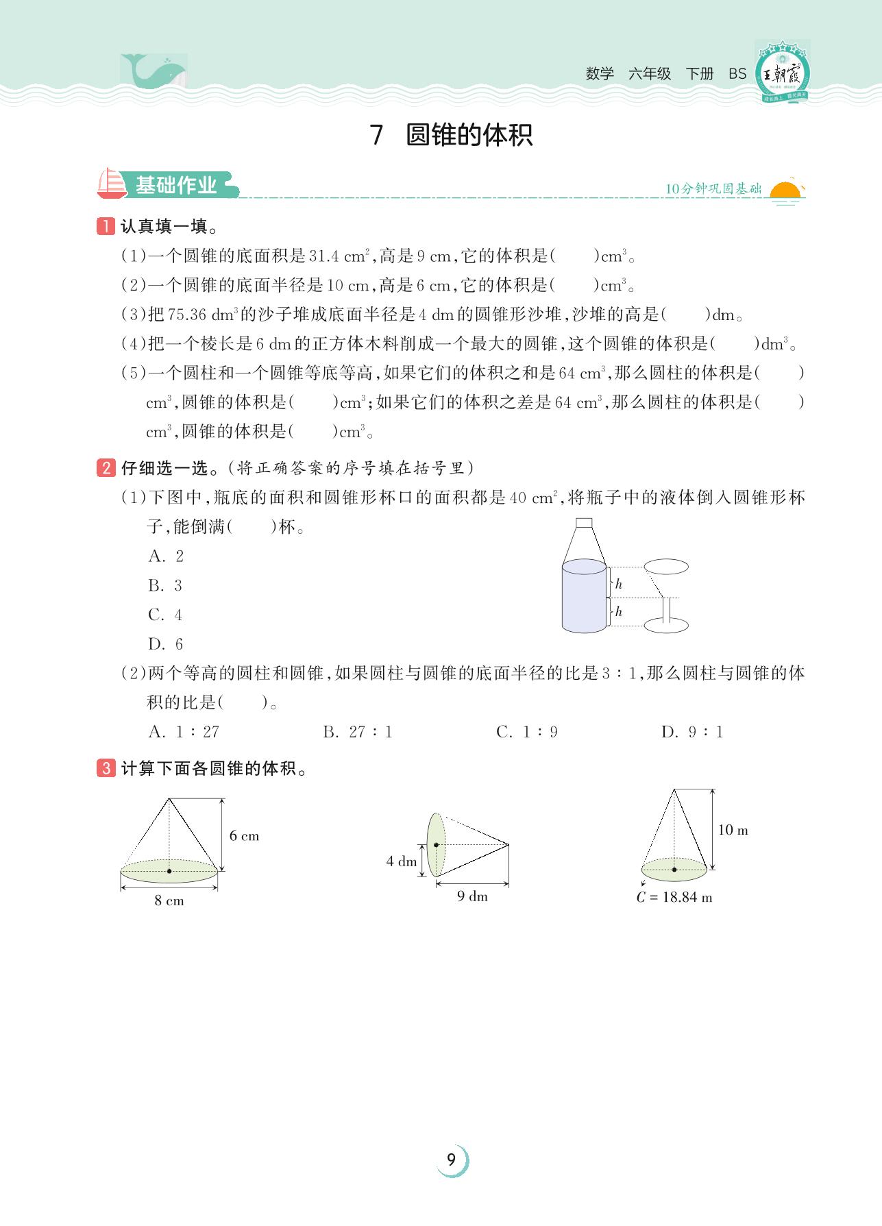 2023下册六年级数学北师版 第一单元 圆柱与圆锥——7 圆锥的体积