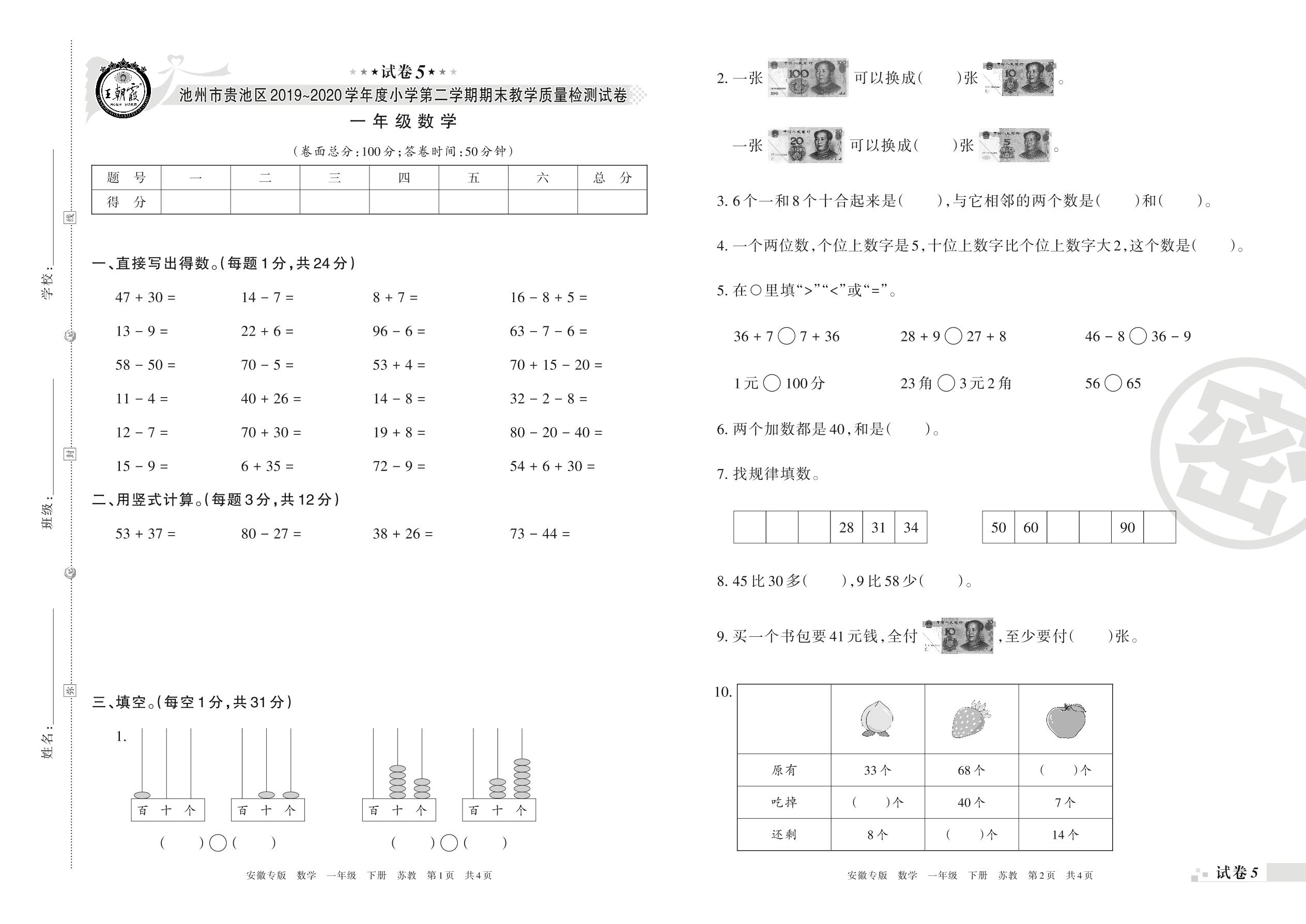 2019-2020学年第二学期池州市贵池区一年级数学试卷(苏教版)【5】