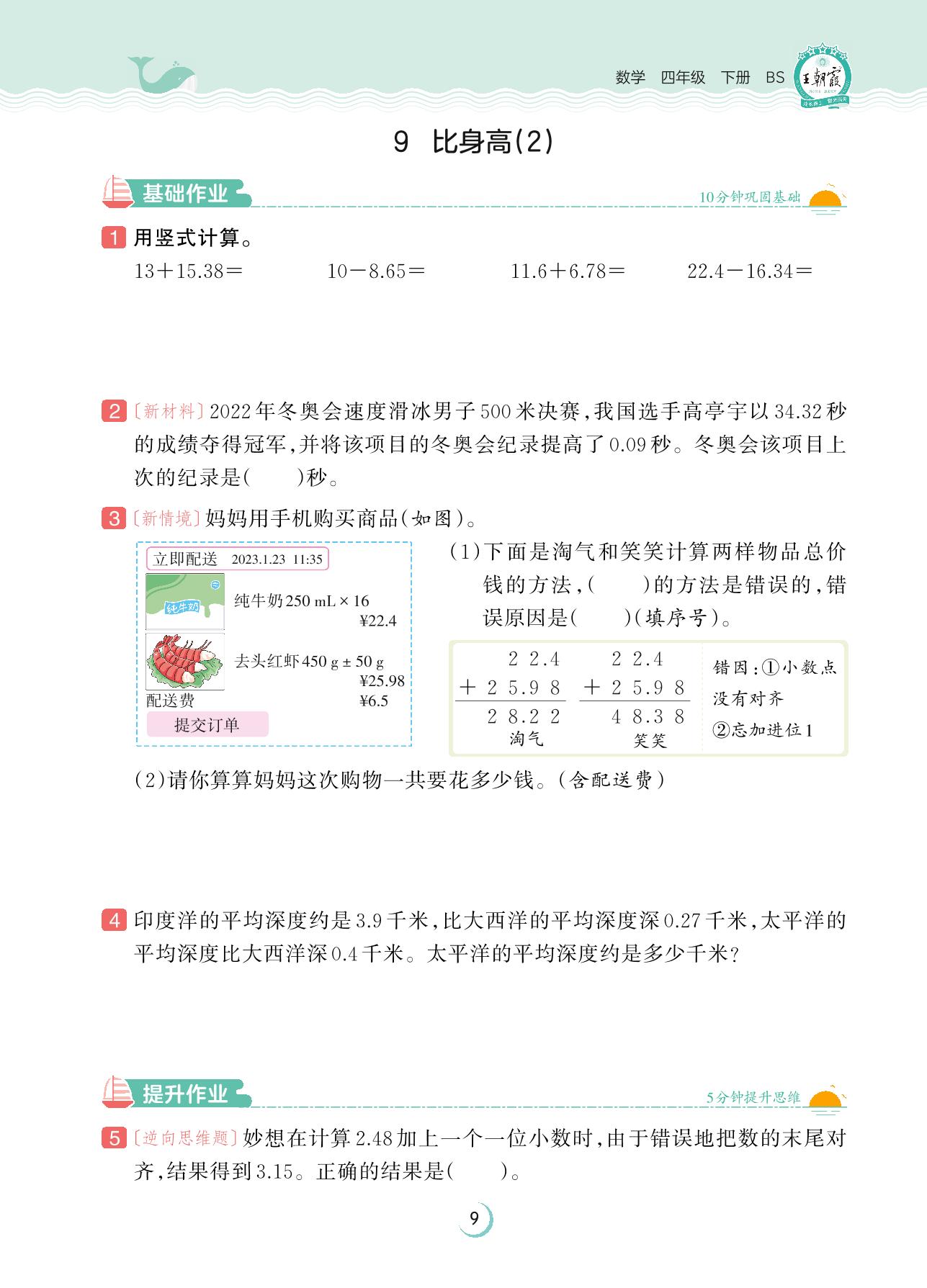 2023下册四年级数学北师版 第一单元 小数的意义和加减法——9 比身高(2)