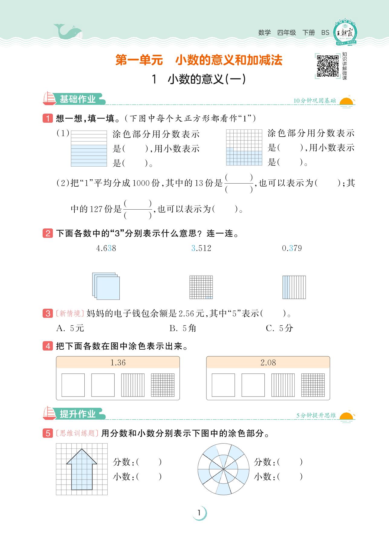 2023下册四年级数学北师版 第一单元 小数的意义和加减法——1 小数的意义(一)