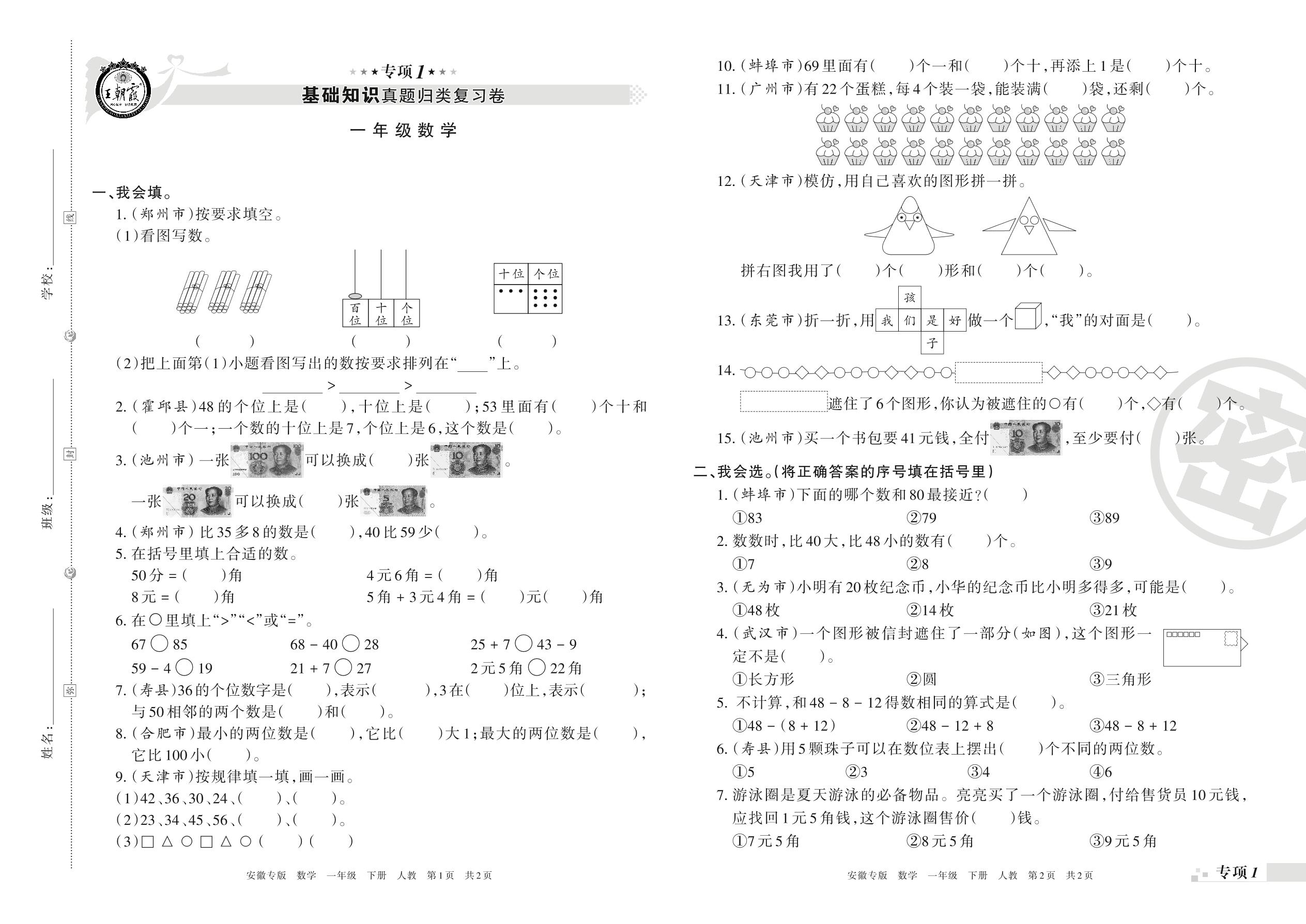 王朝霞期末专项卷——基础知识、计算真题归类复习一年级下册数学(人教版)_R210802205907【0】