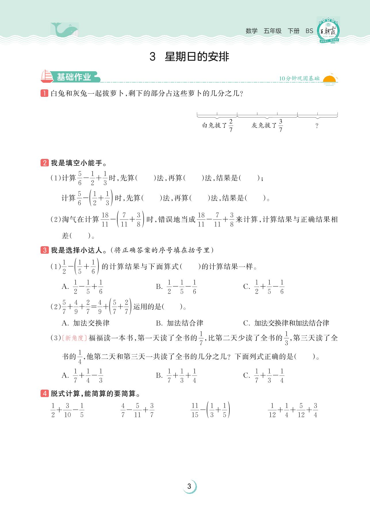 2023下册五年级数学北师版 第一单元 分数加减法——3 星期日的安排