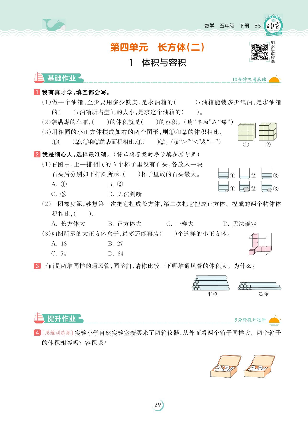 2023下册五年级数学北师版 第四单元 长方体(二)——1 体积与容积