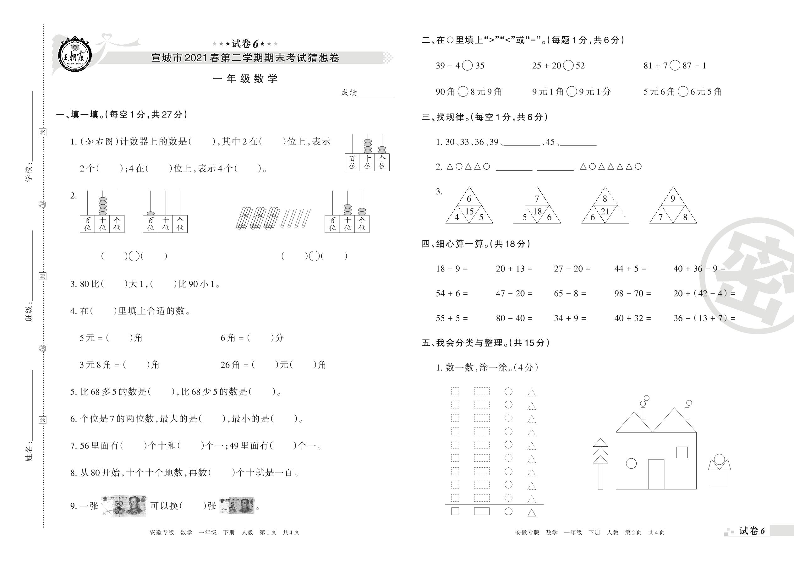 2019-2020学年第二学期宣城市一年级数学试卷(人教版)【6】