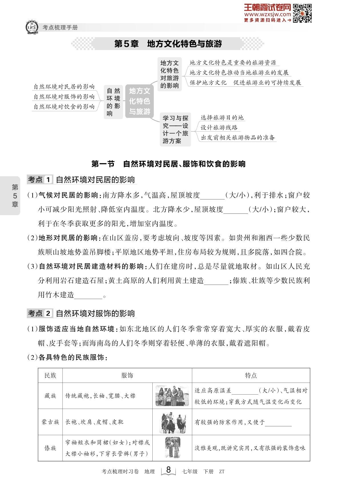 2023下册七年级地理中图版 考点梳理手册——第5章 地方文化特色与旅游