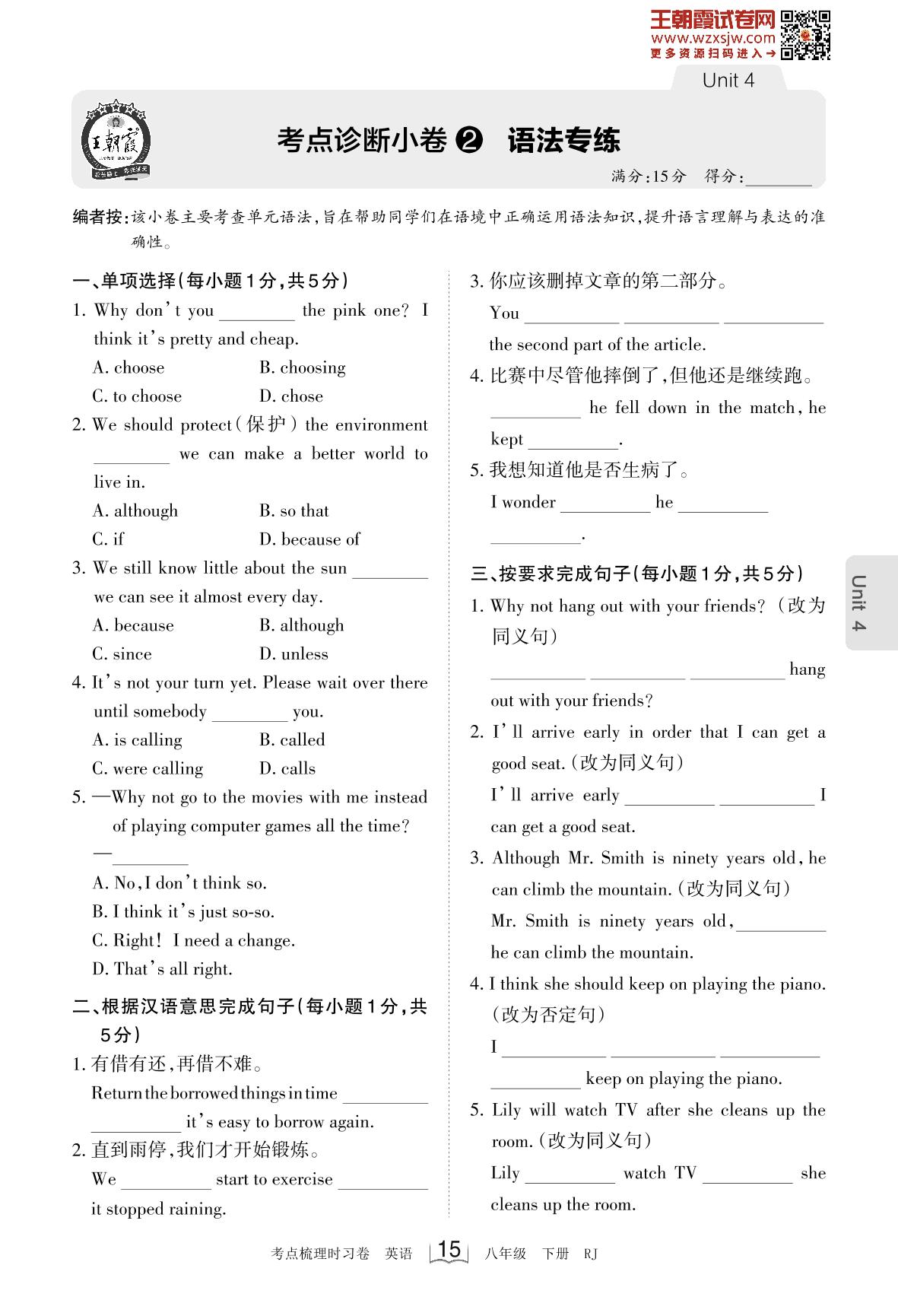 2023下册八年级英语人教版 Unit 4 考点诊断小卷2 语法专练