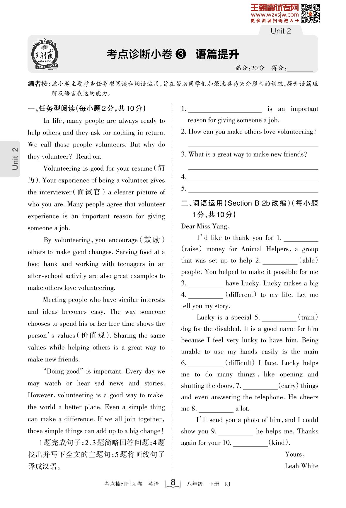 2023下册八年级英语人教版 Unit 2 考点诊断小卷3 语篇提升