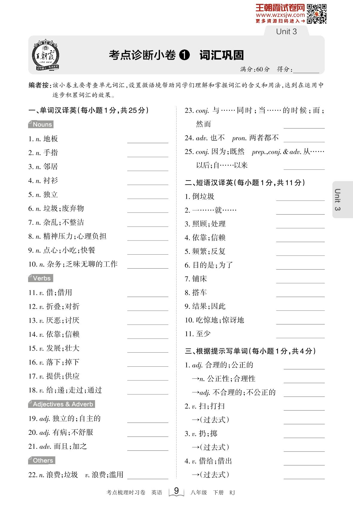 2023下册八年级英语人教版 Unit 3 考点诊断小卷1 词汇巩固