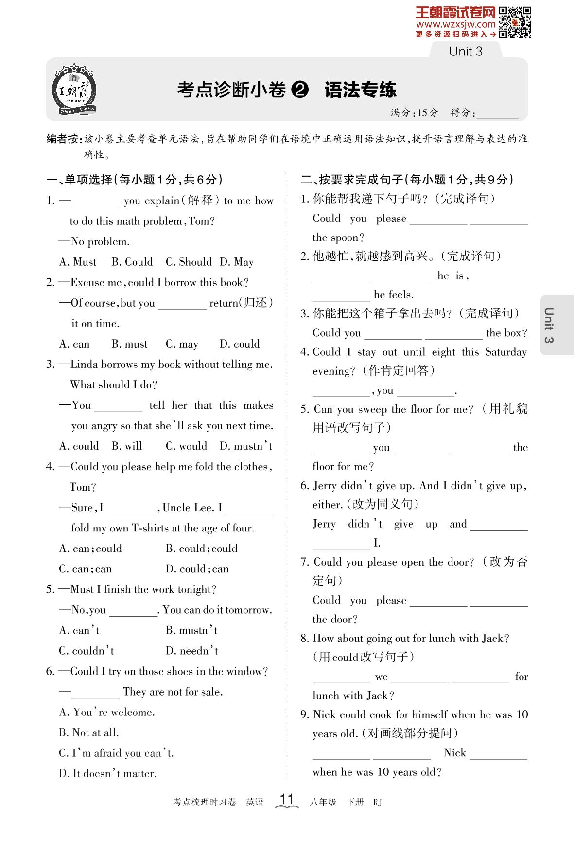 2023下册八年级英语人教版 Unit 3 考点诊断小卷2 语法专练
