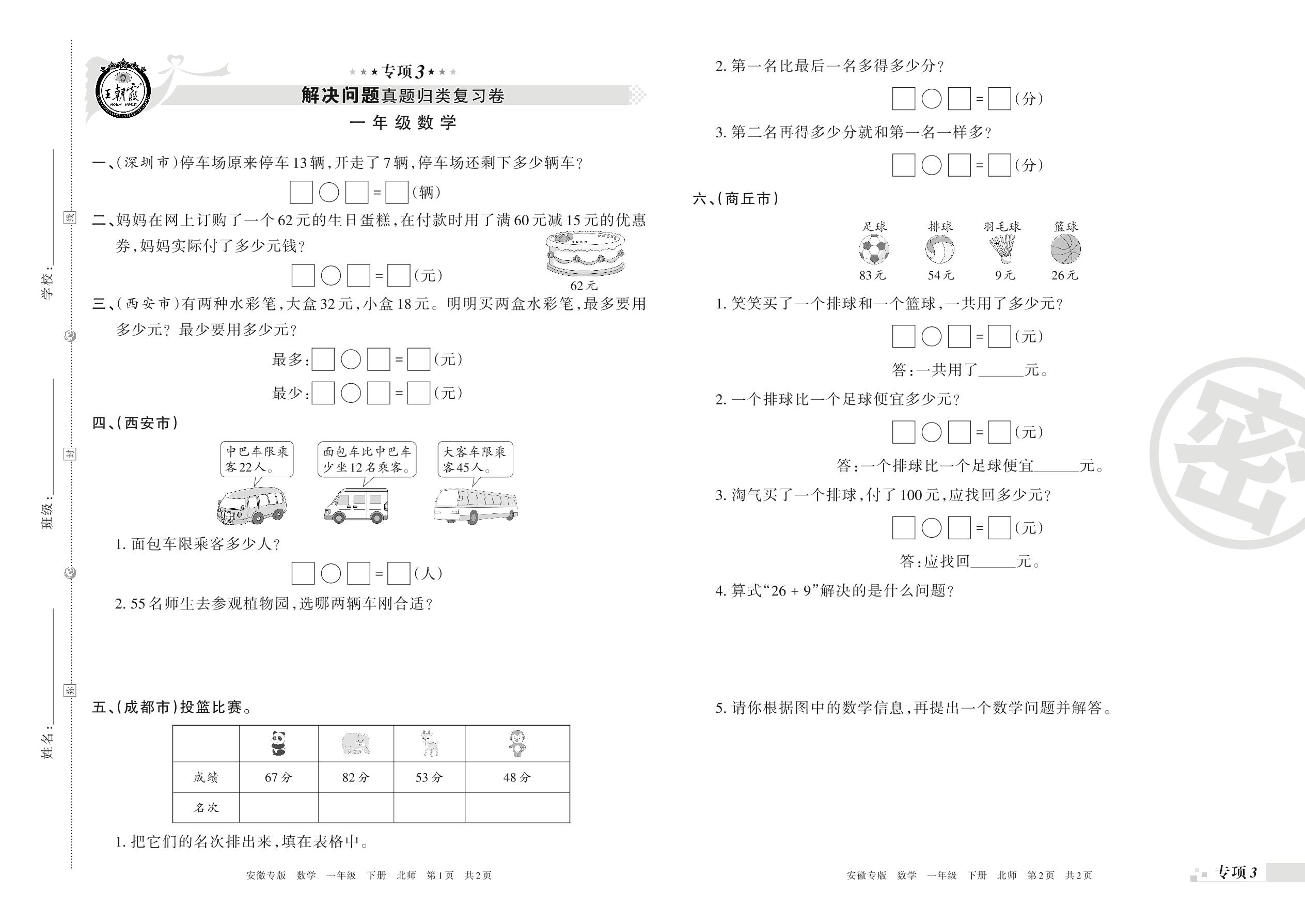 王朝霞期末专项卷——解决问题真题归类复习、新颖题速递:生活与数学一年级下册数学(北师版)【0】