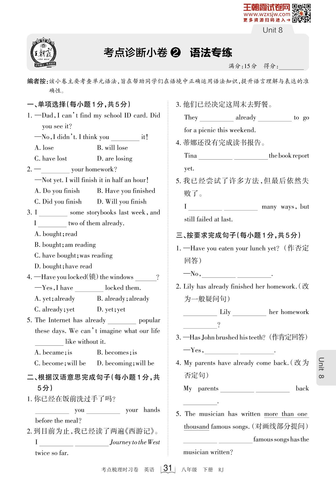 2023下册八年级英语人教版 Unit 8 考点诊断小卷2 语法专练