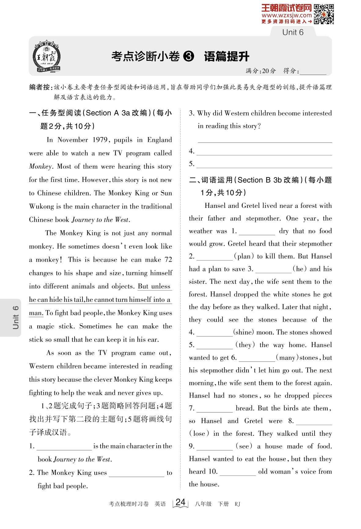 2023下册八年级英语人教版 Unit 6 考点诊断小卷3 语篇提升