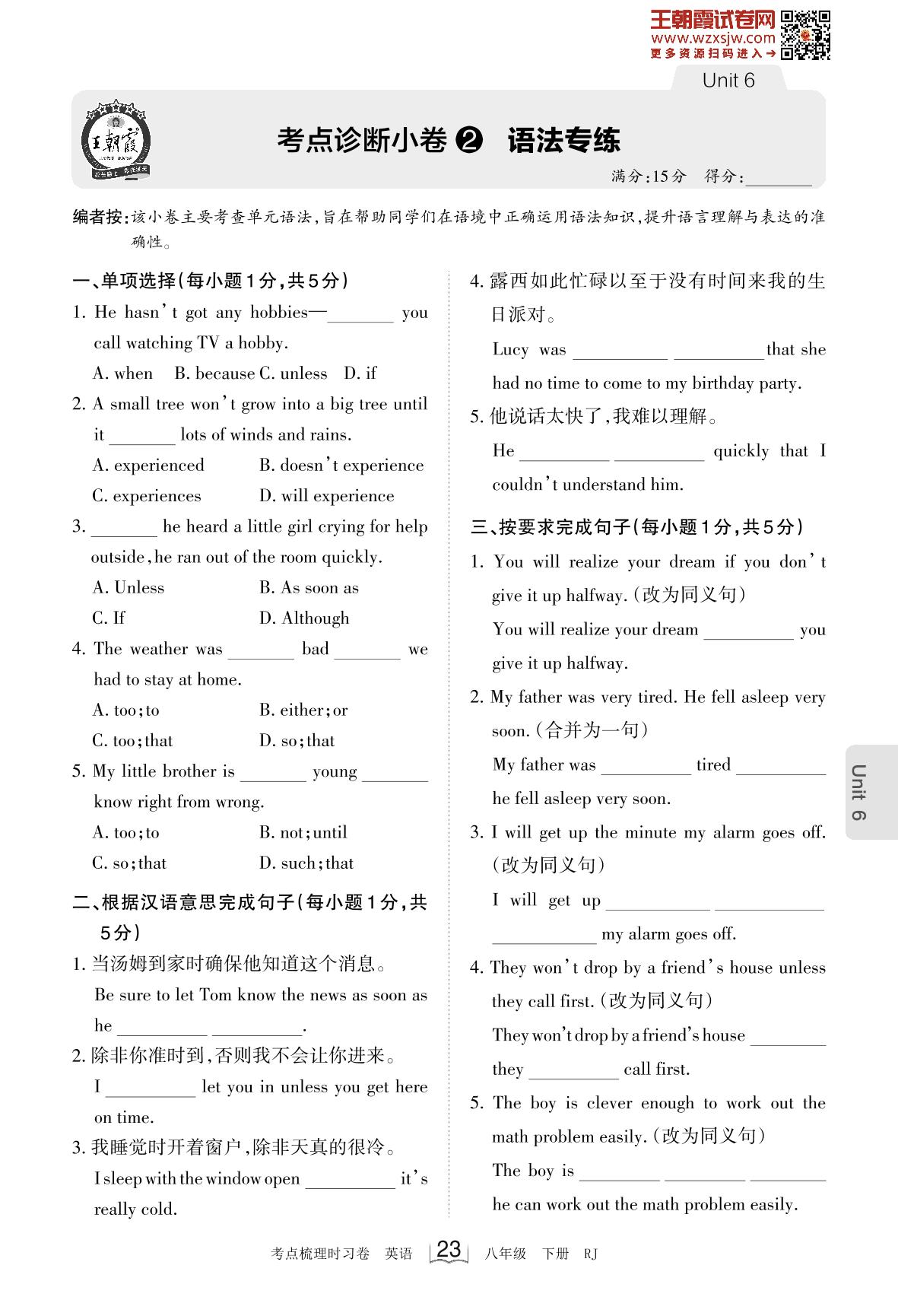2023下册八年级英语人教版 Unit 6 考点诊断小卷2 语法专练