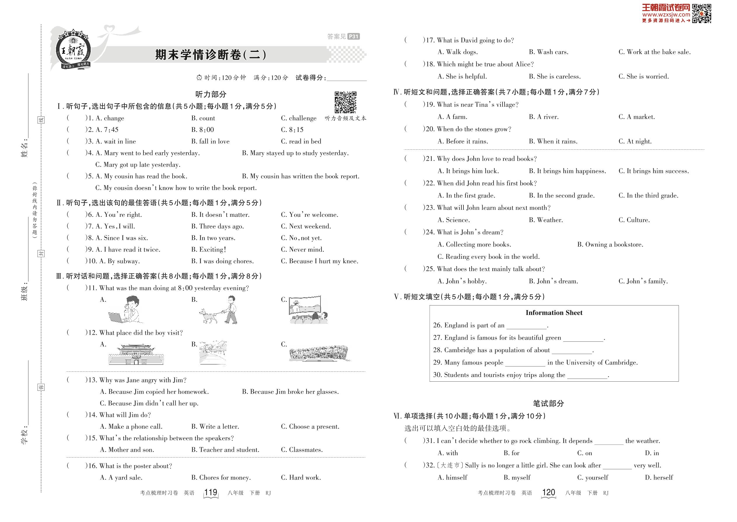 2023下册八年级英语人教版 期末学情诊断卷(二)