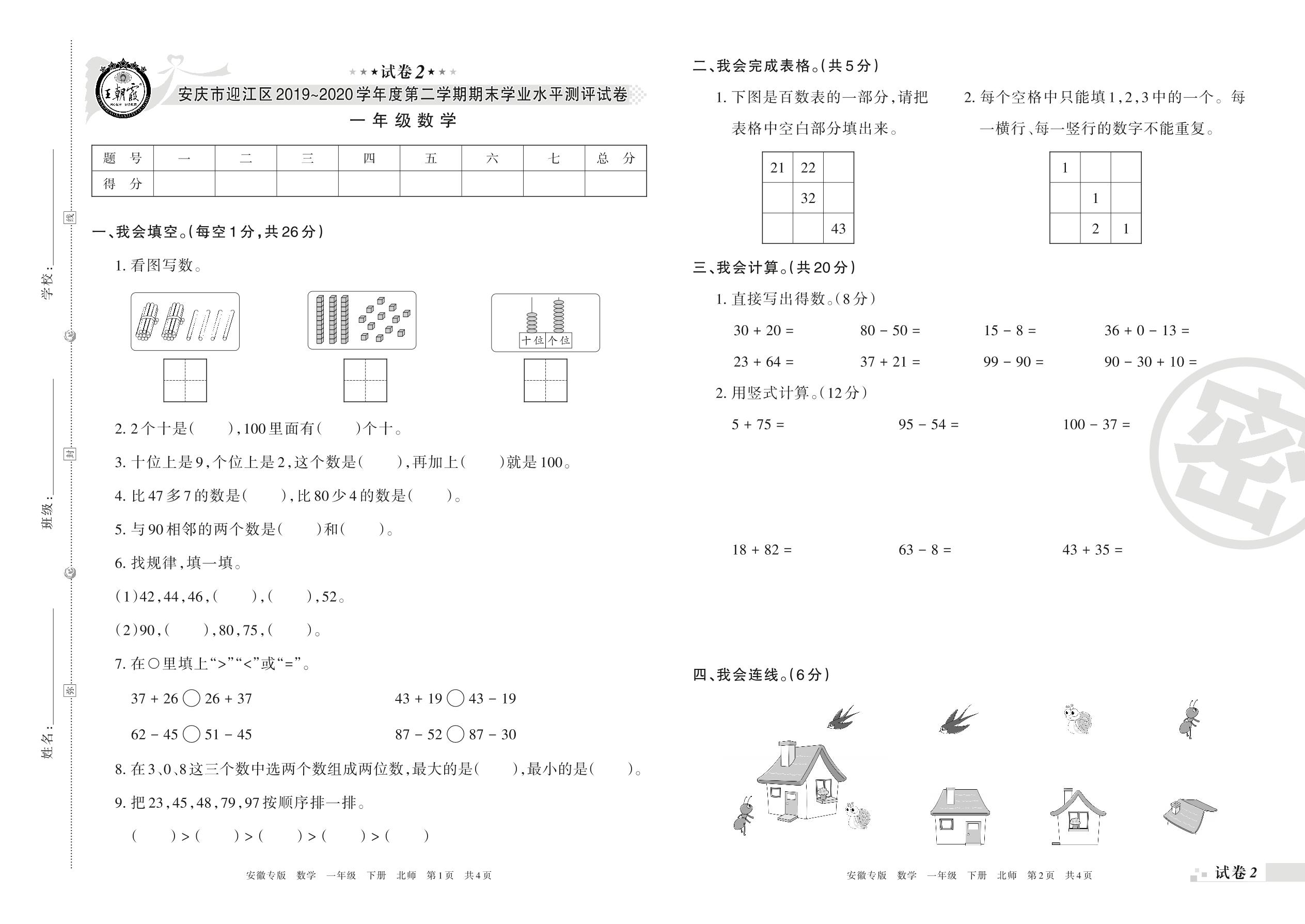 2019-2020学年第二学期安庆市迎江区一年级数学试卷(北师版)【2】