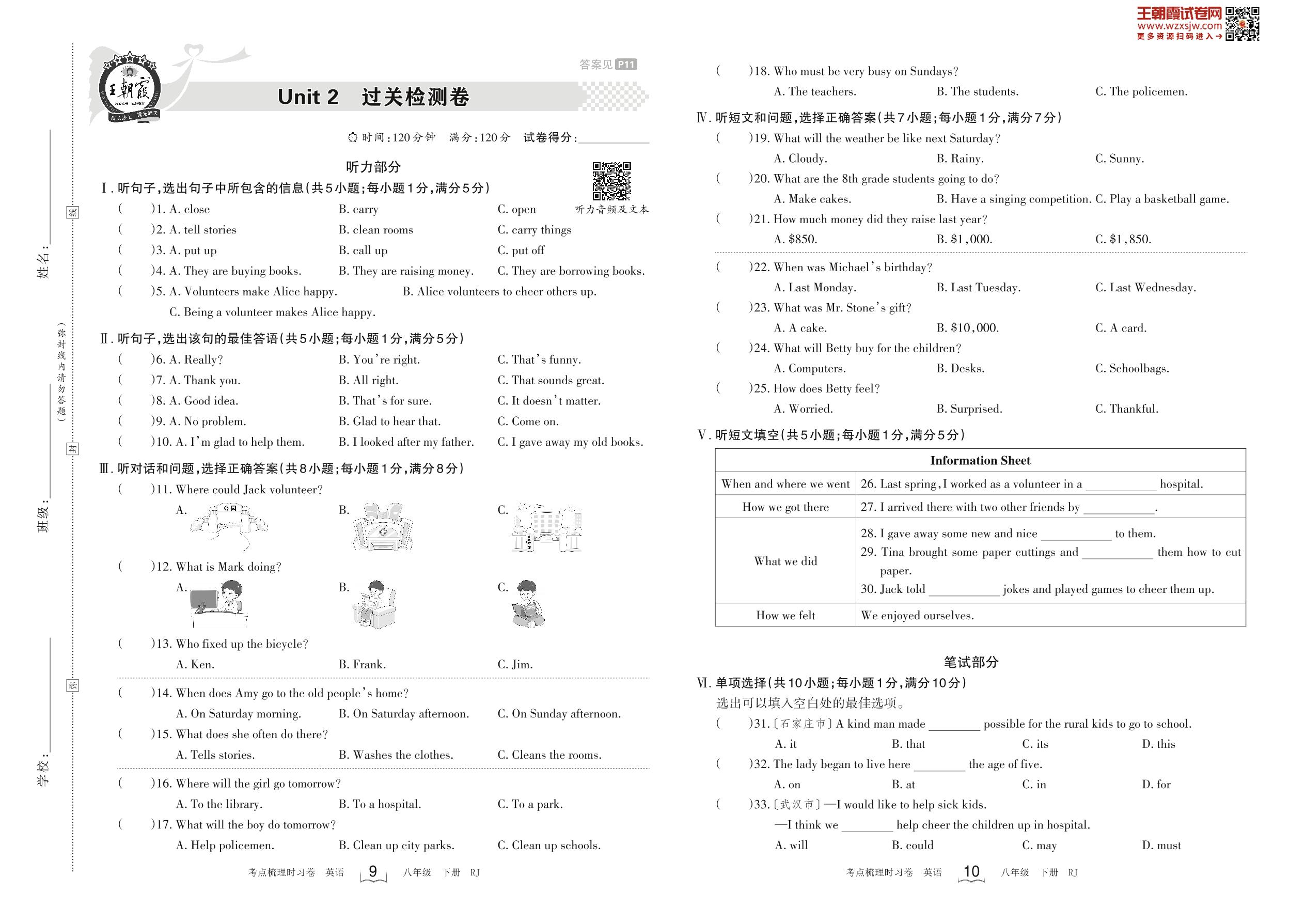 2023下册八年级英语人教版 Unit 2 过关检测卷
