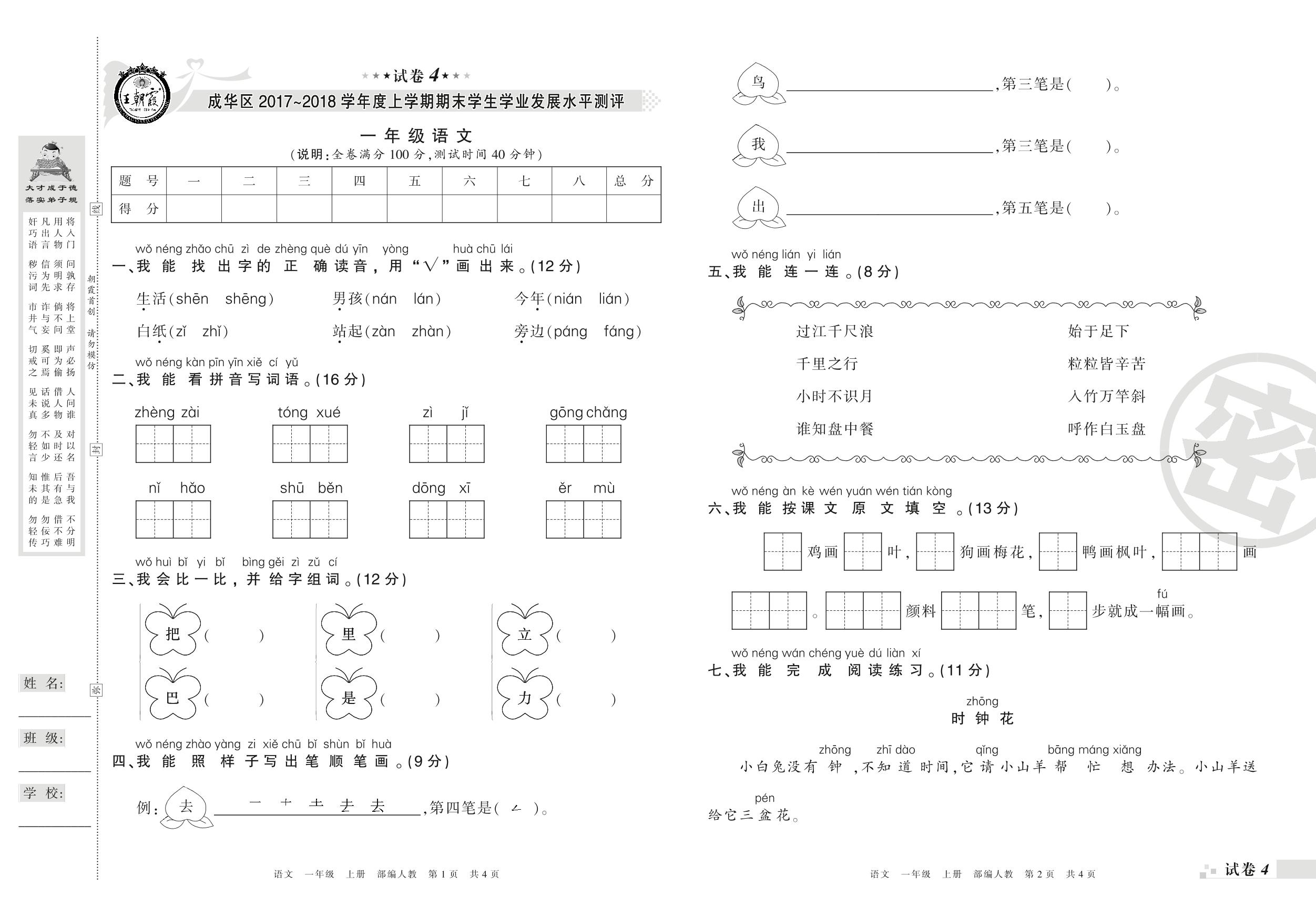 2017-2018学年第一学期成都市成华区一年级语文试卷(人教版)【4】