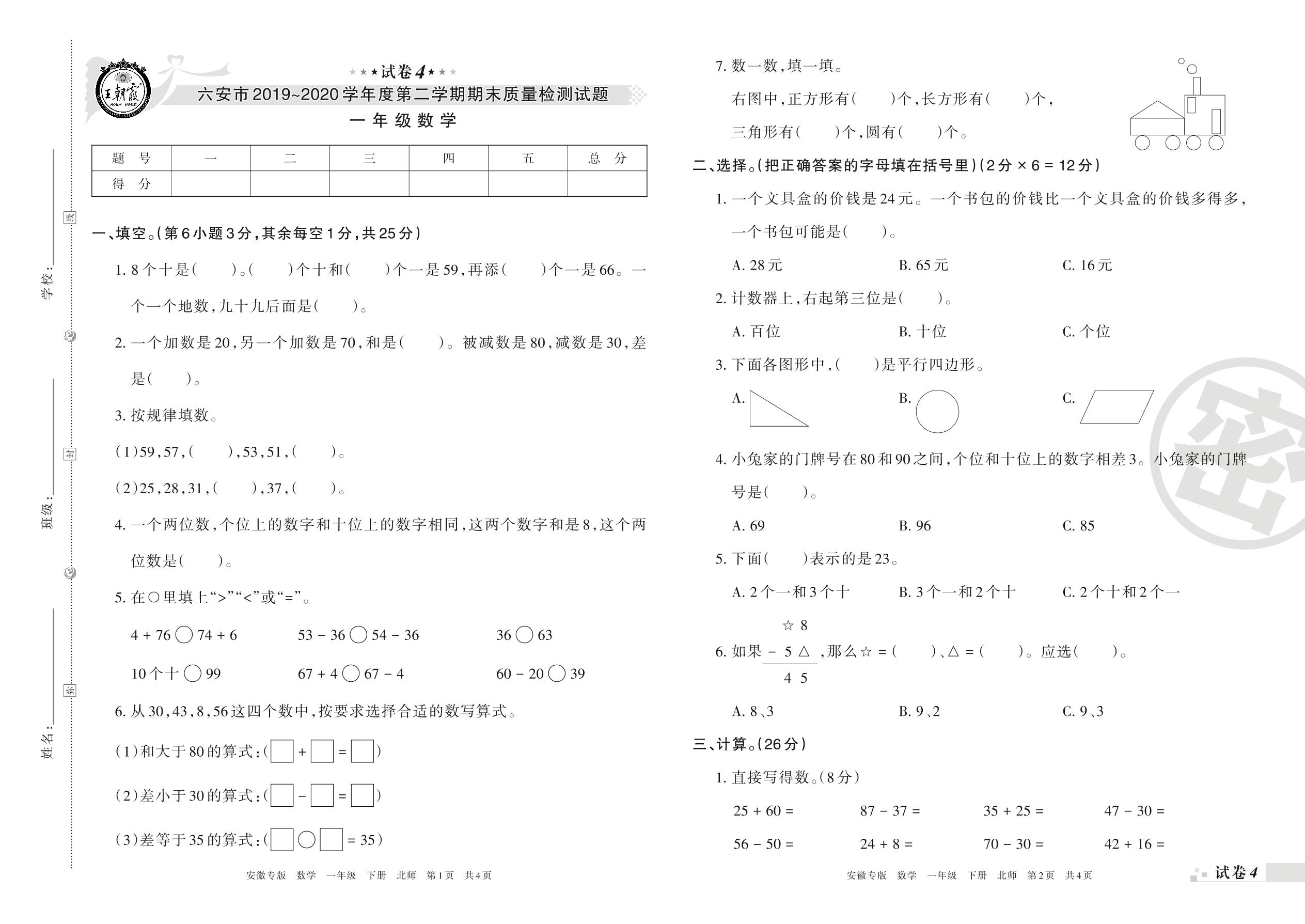 2019-2020学年第二学期六安市一年级数学试卷(北师版)【4】