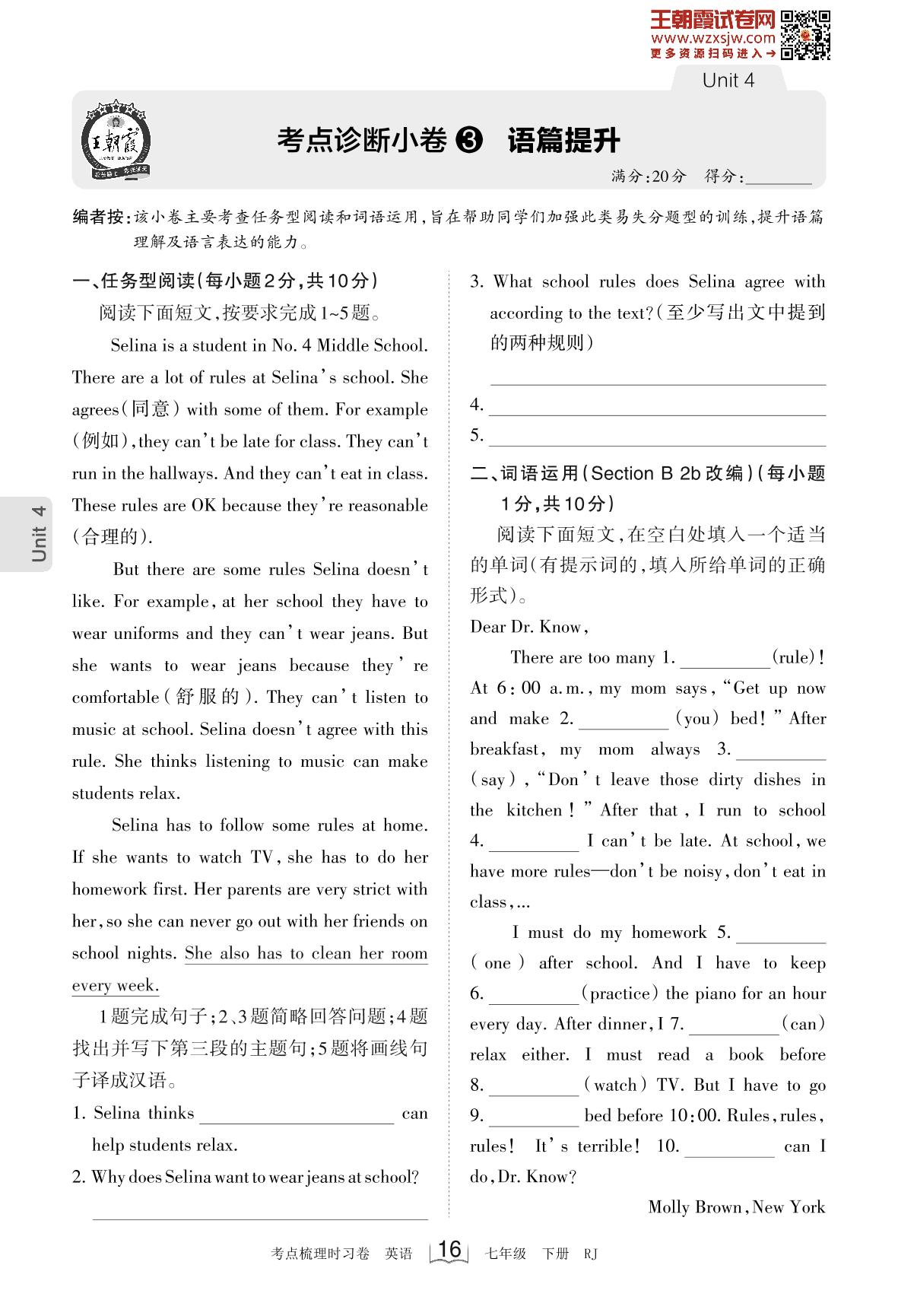 2023下册七年级英语人教版 Unit 4 考点诊断小卷3 语篇提升