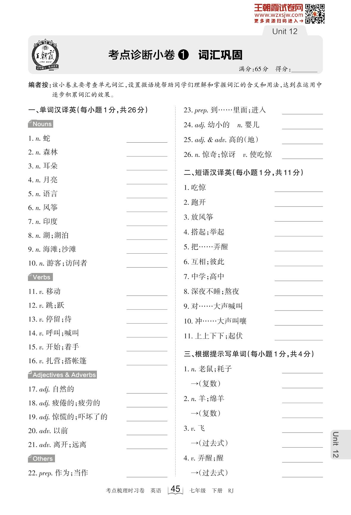 2023下册七年级英语人教版 Unit 12 考点诊断小卷1 词汇巩固