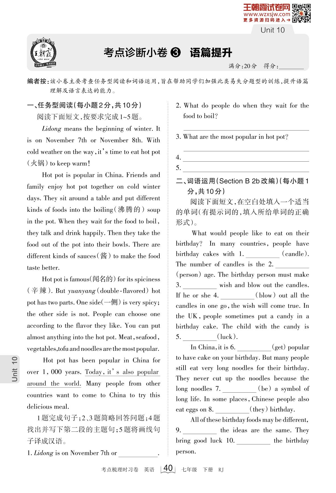 2023下册七年级英语人教版 Unit 10 考点诊断小卷3 语篇提升