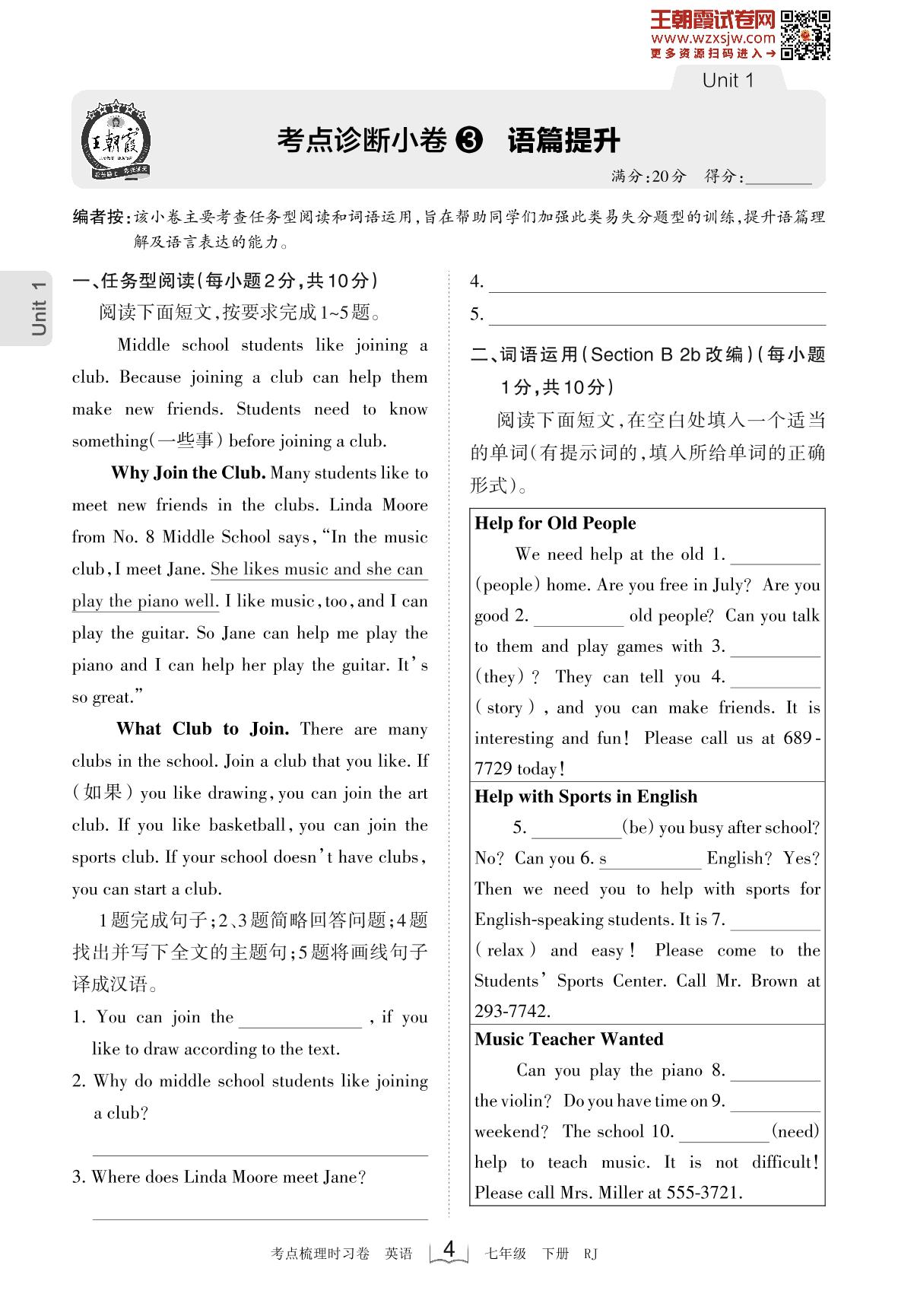 2023下册七年级英语人教版 Unit 1 考点诊断小卷3 语篇提升