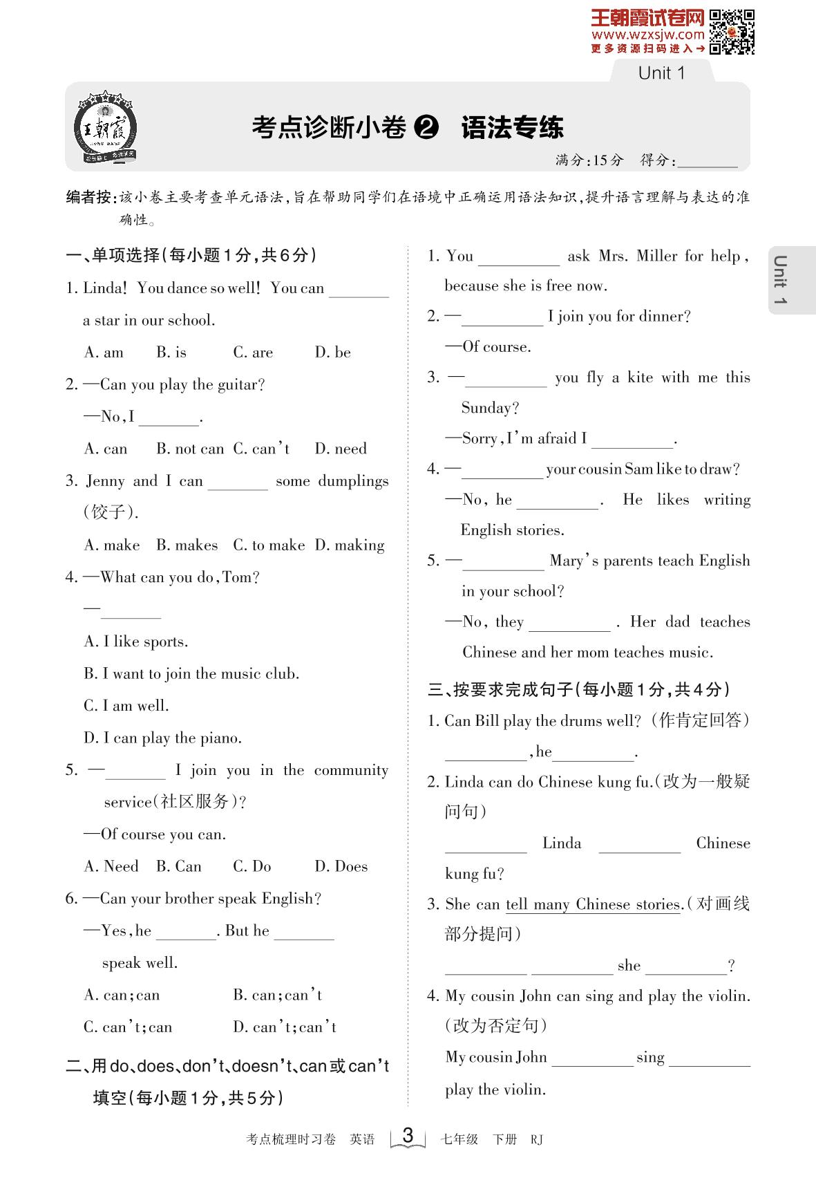 2023下册七年级英语人教版 Unit 1 考点诊断小卷2 语法专练