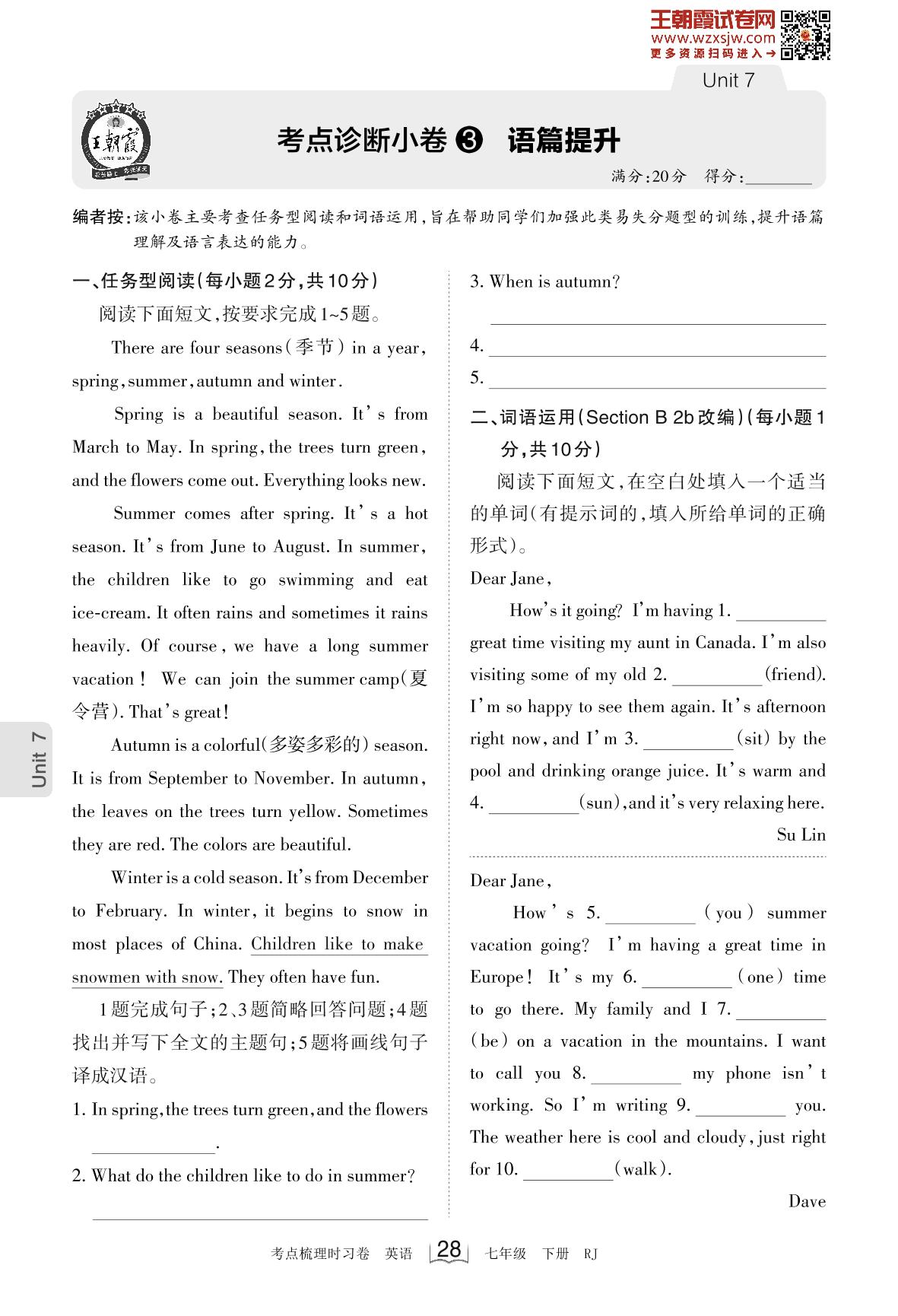 2023下册七年级英语人教版 Unit 7 考点诊断小卷3 语篇提升