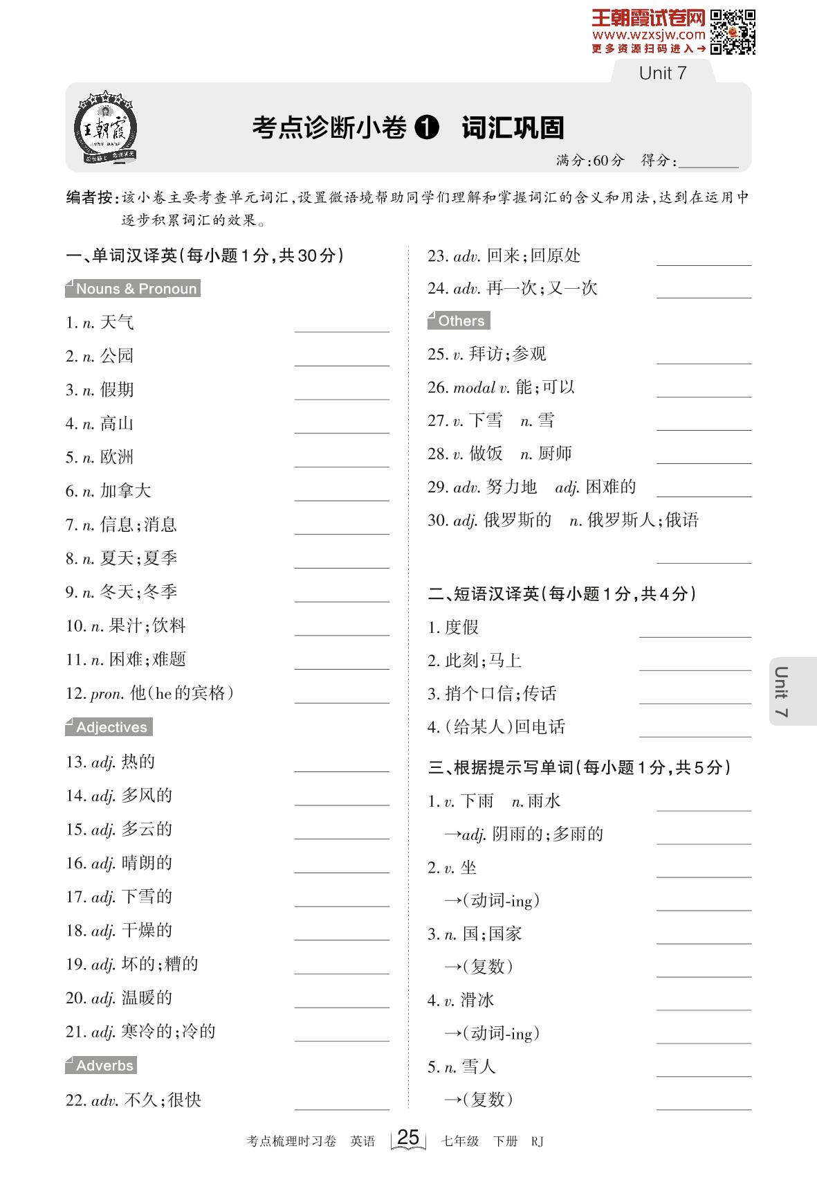 2023下册七年级英语人教版 Unit 7 考点诊断小卷1 词汇巩固