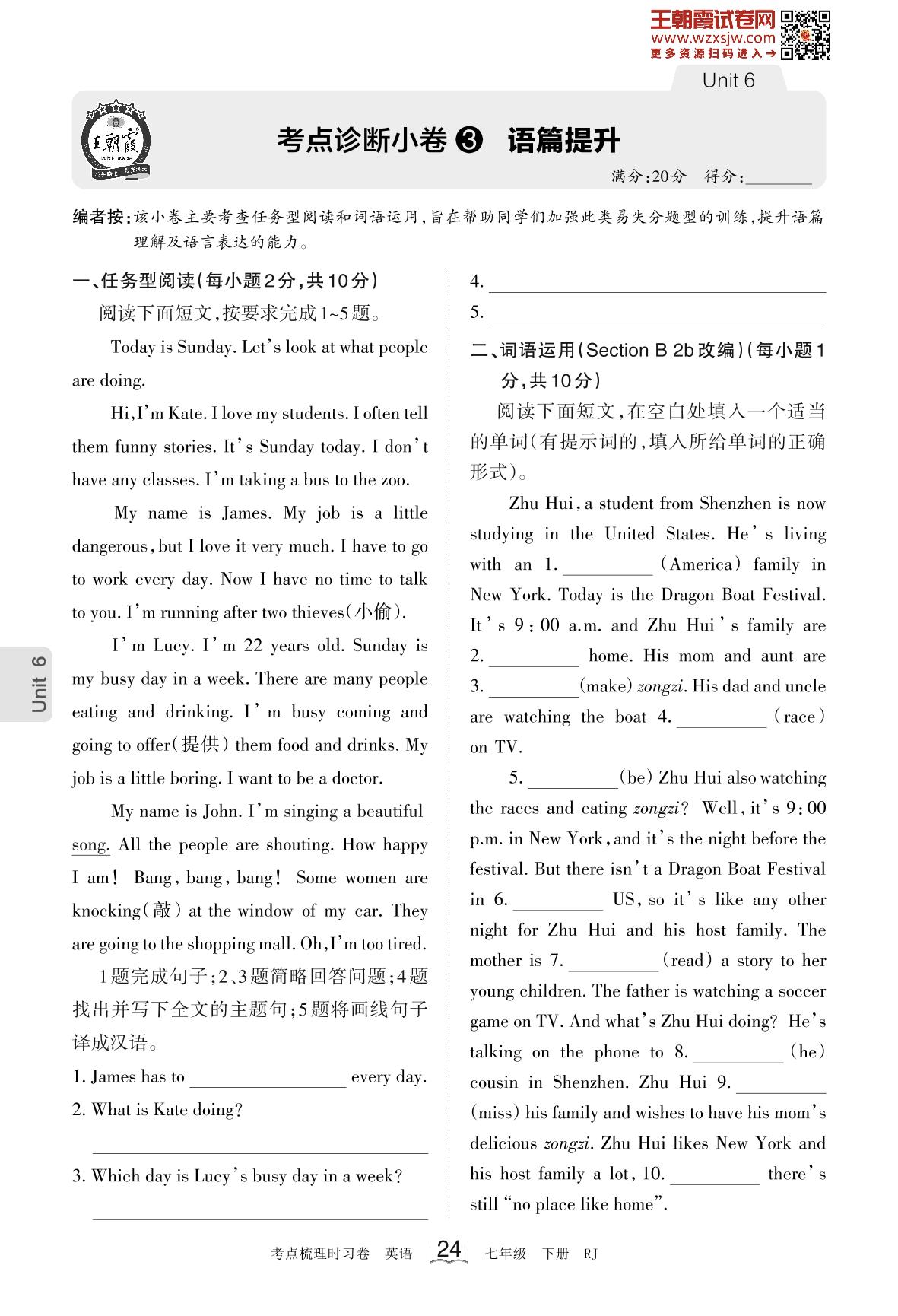 2023下册七年级英语人教版 Unit 6 考点诊断小卷3 语篇提升