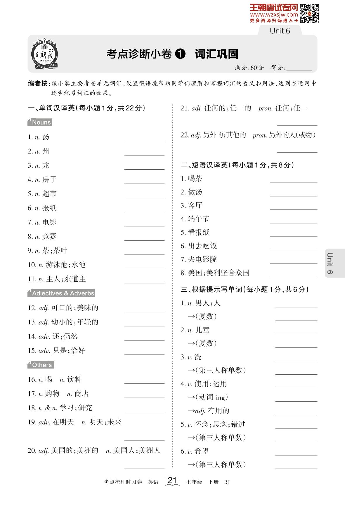 2023下册七年级英语人教版 Unit 6 考点诊断小卷1 词汇巩固