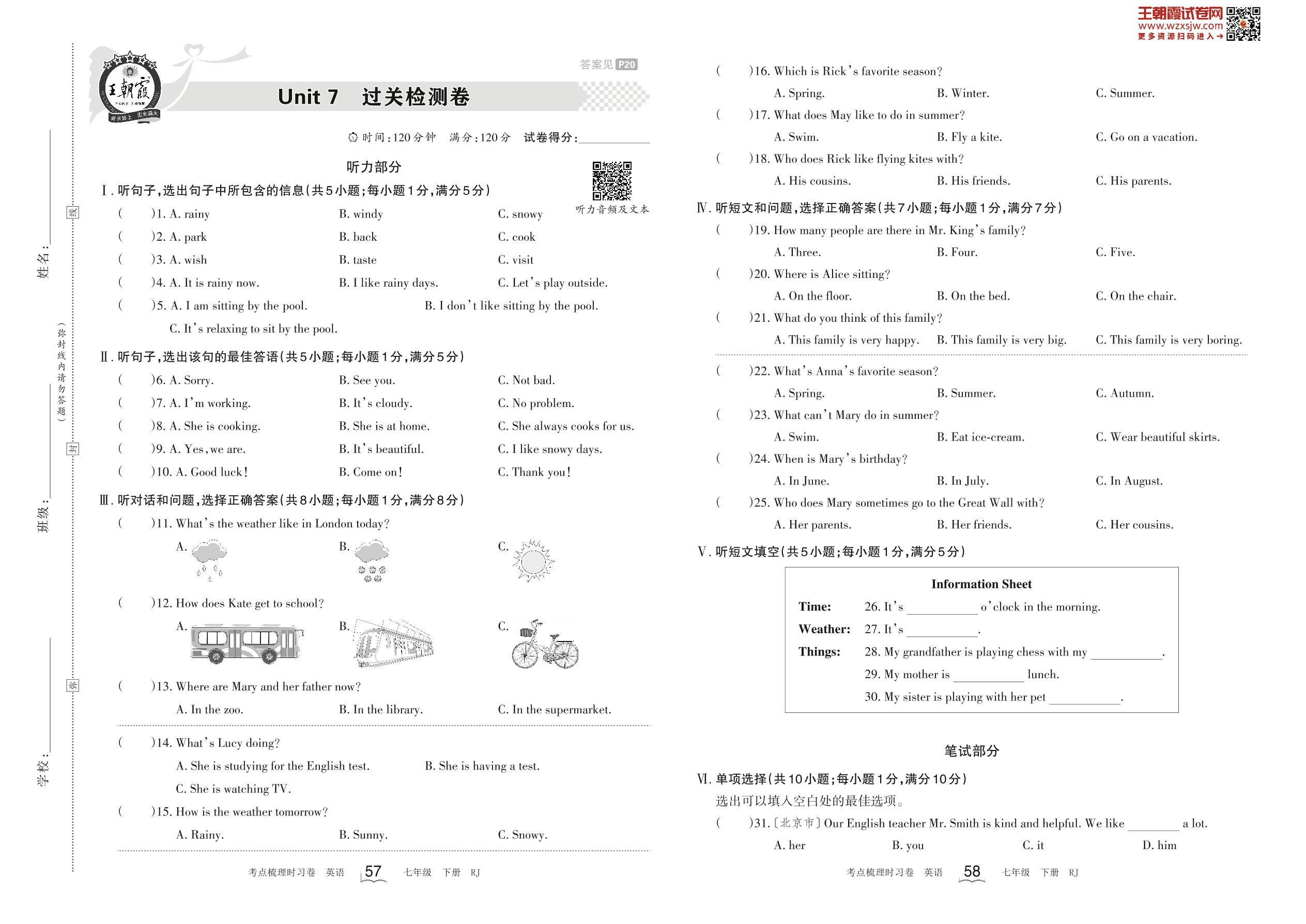 2023下册七年级英语人教版 Unit 7 过关检测卷