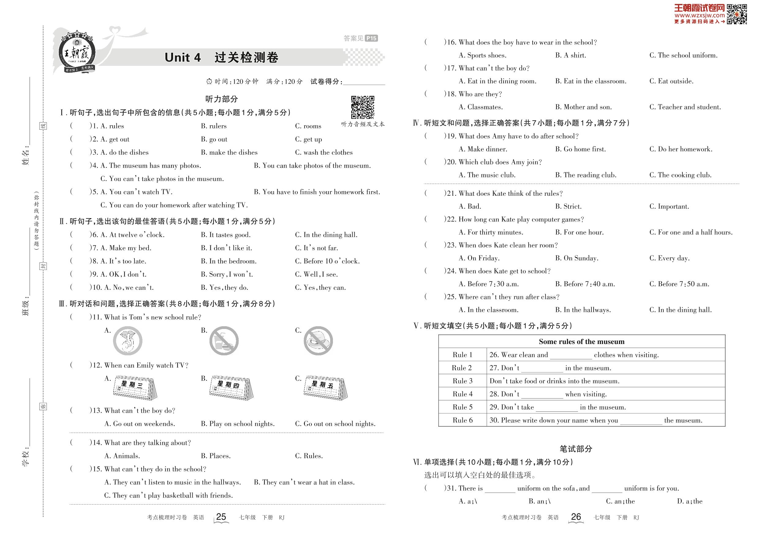 2023下册七年级英语人教版 Unit 4 过关检测卷