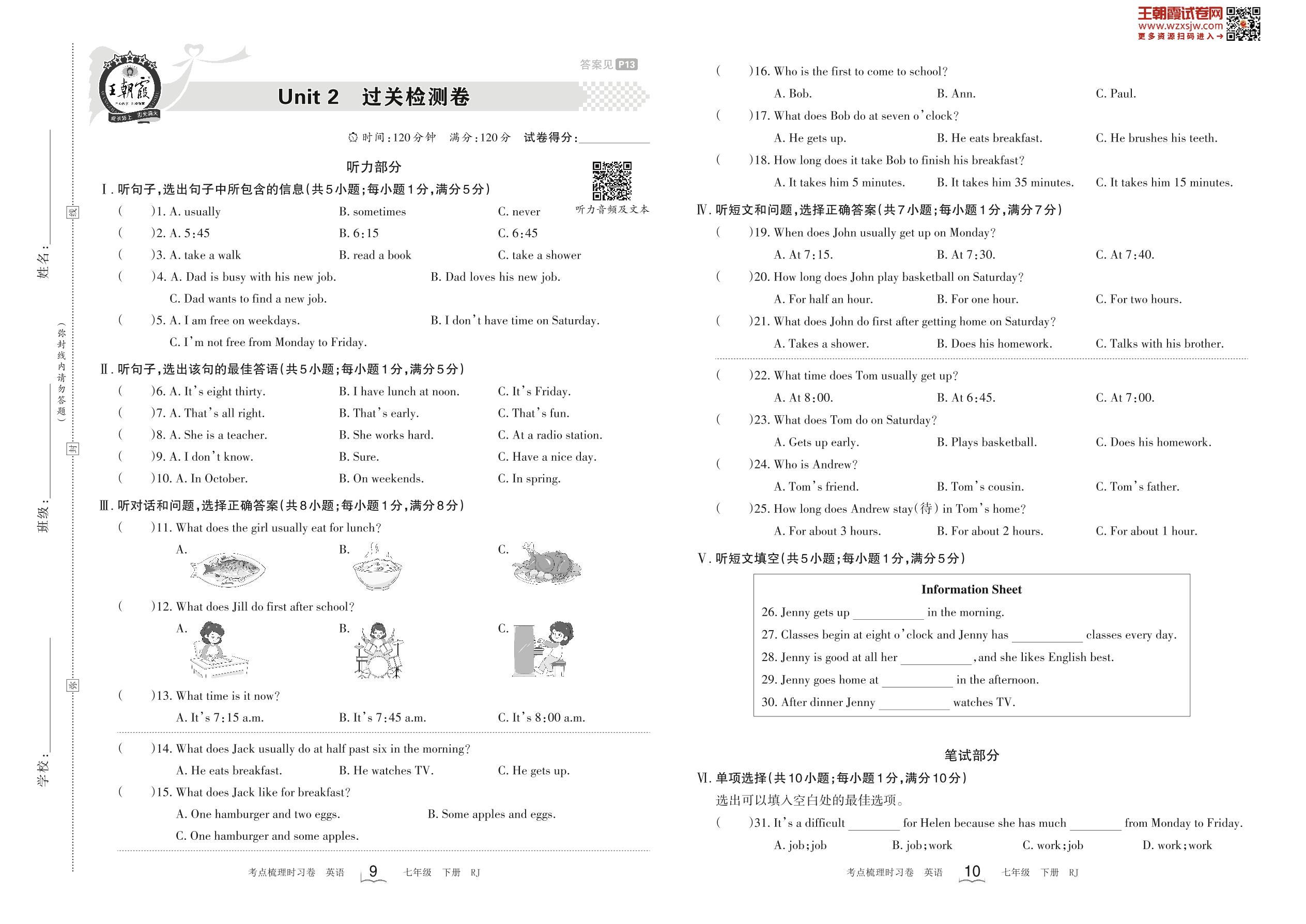 2023下册七年级英语人教版 Unit 2 过关检测卷