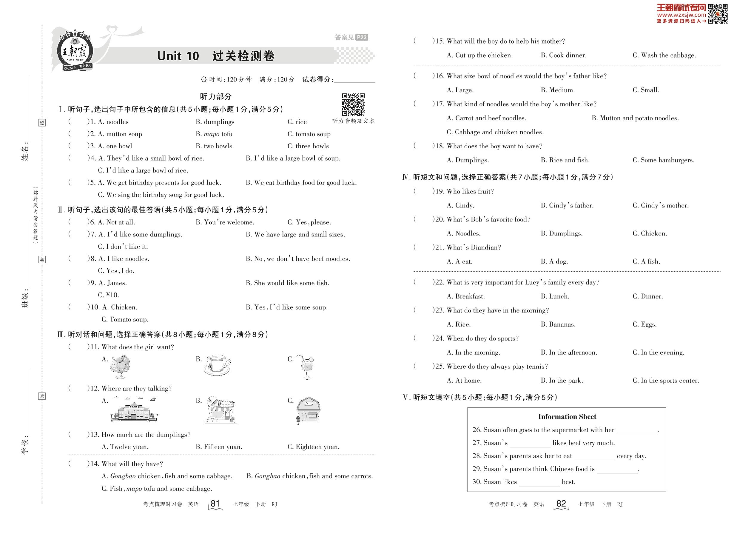 2023下册七年级英语人教版 Unit 10 过关检测卷