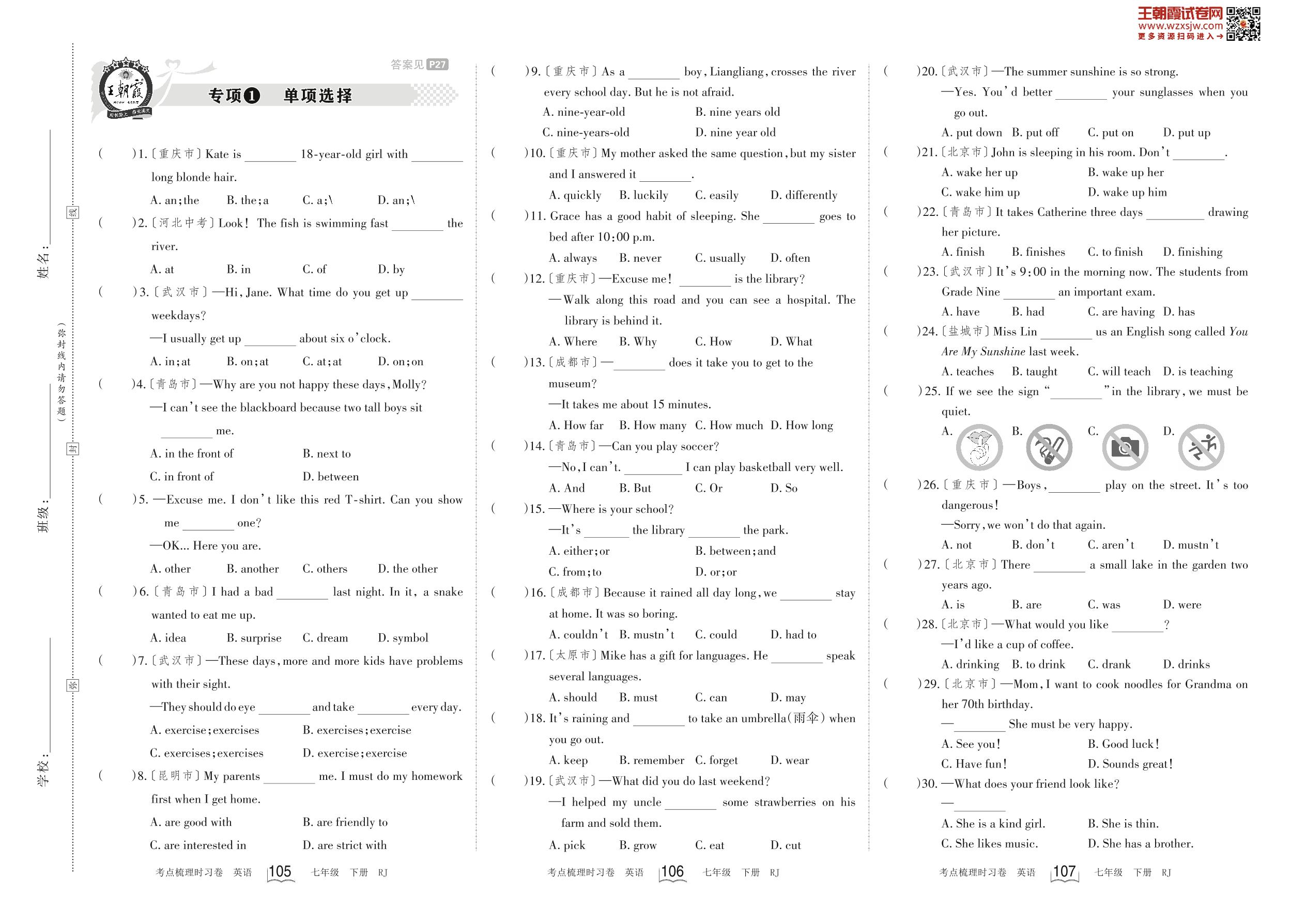 2023下册七年级英语人教版 专项1 单项选择