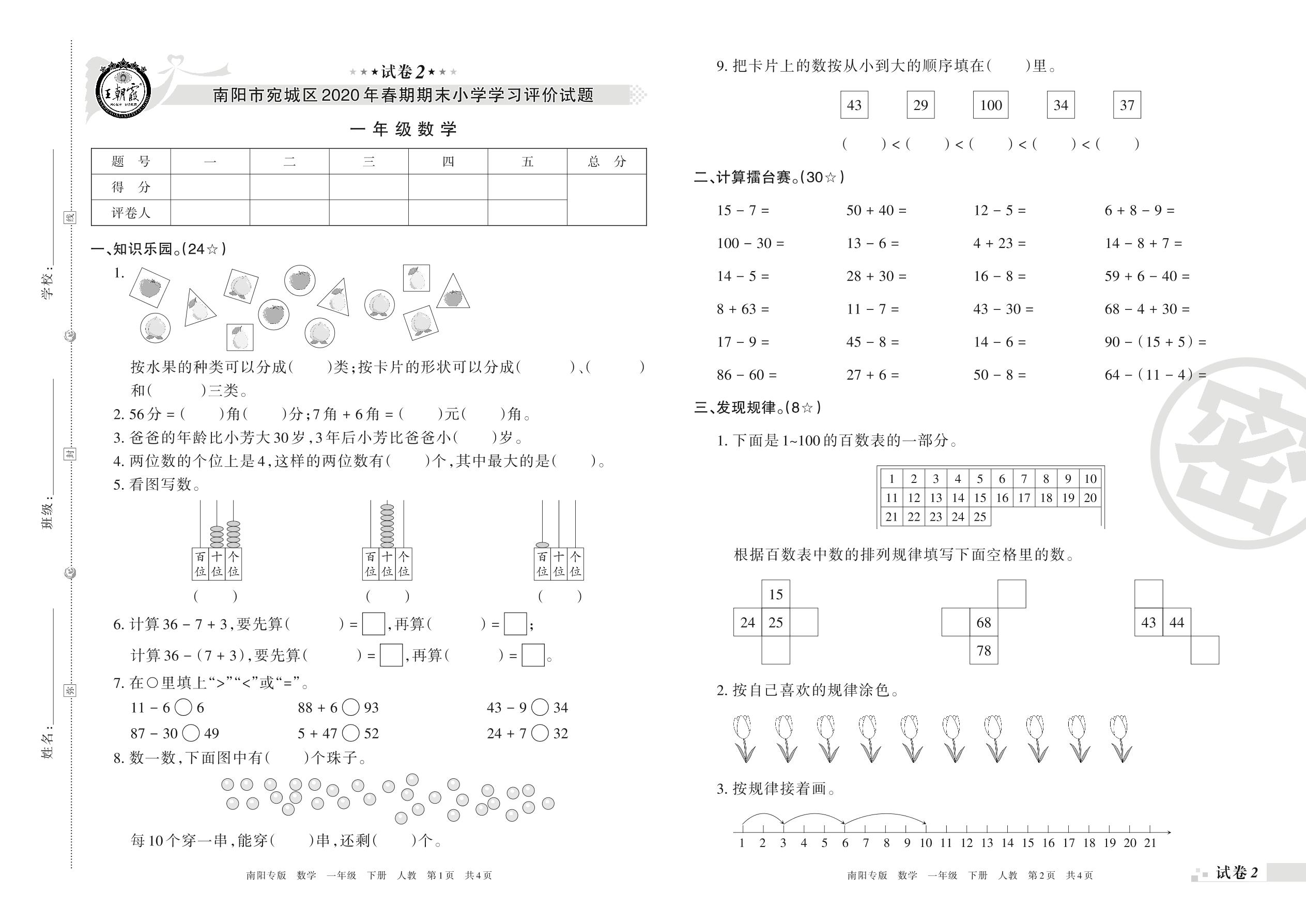 2019-2020学年第二学期南阳市宛城区一年级数学试卷(人教版)【2】