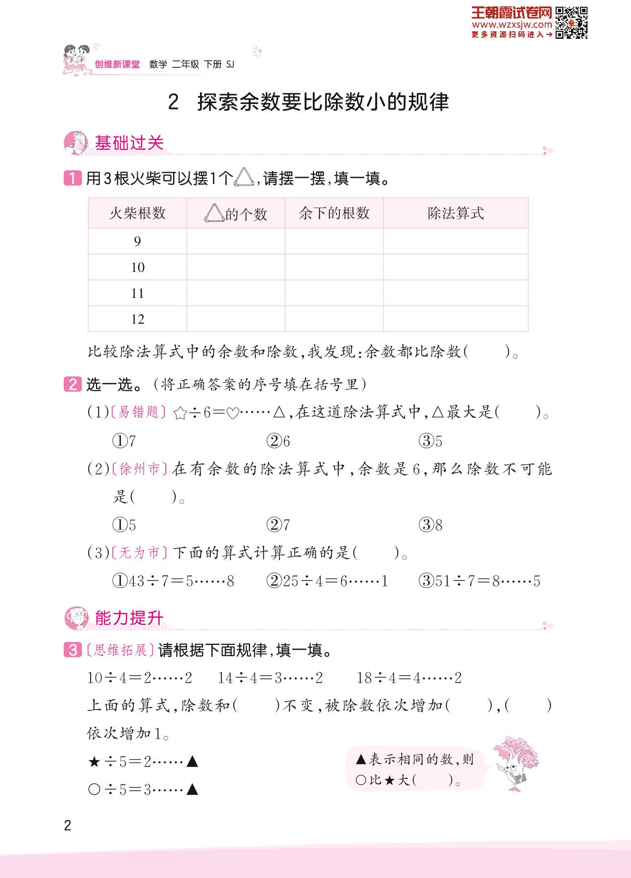 2023下册二年级数学苏教版 一 有余数的除法——2 探索余数要比除数小的规律