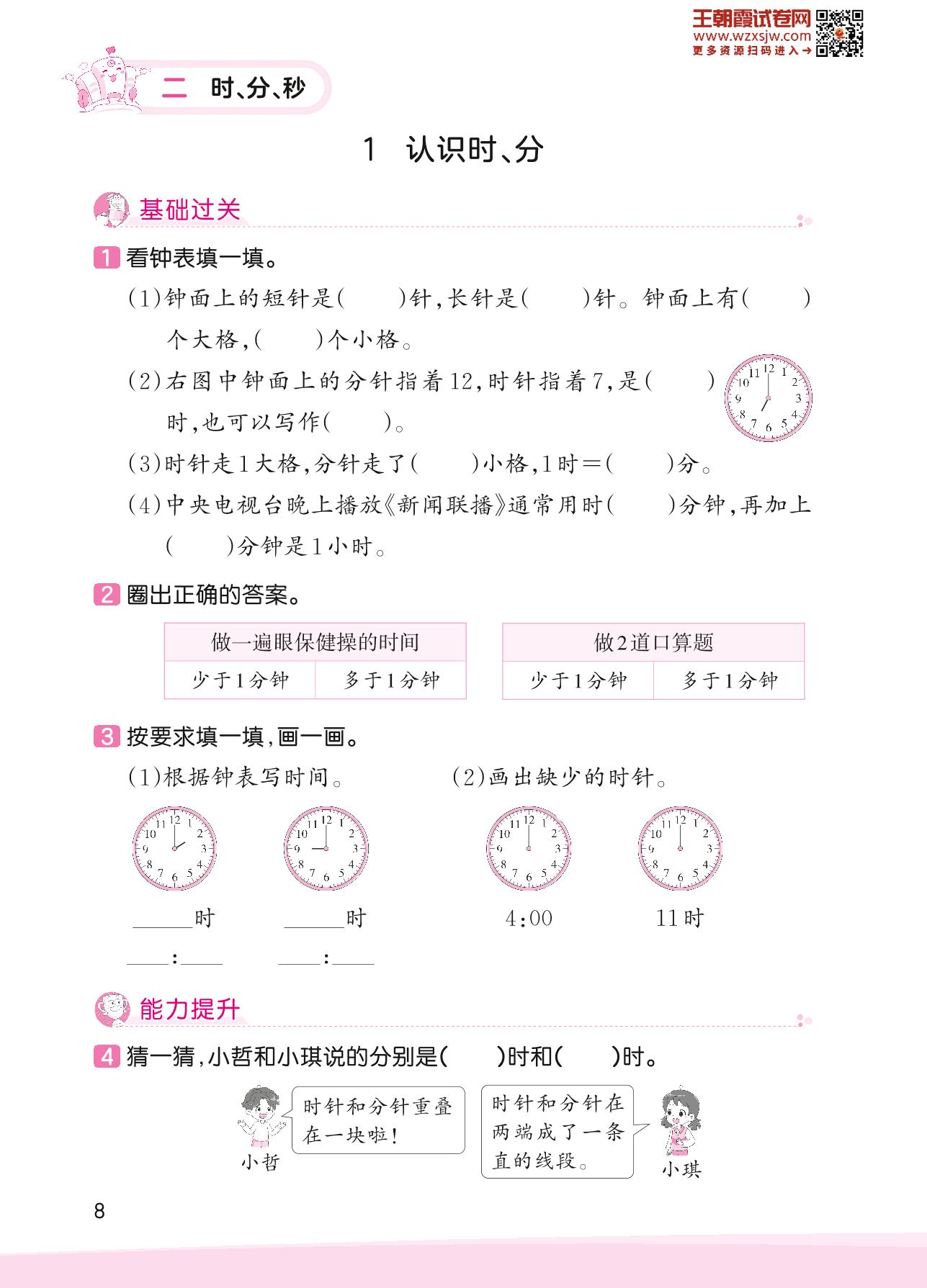 2023下册二年级数学苏教版 二 时、分、秒——1 认识时、分