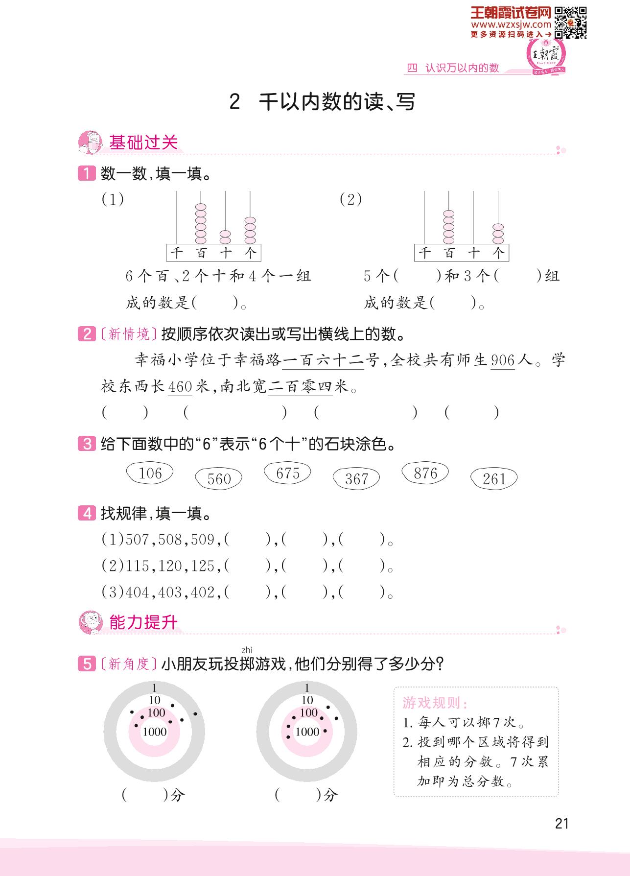 2023下册二年级数学苏教版 四 认识万以内的数——2 千以内数的读、写