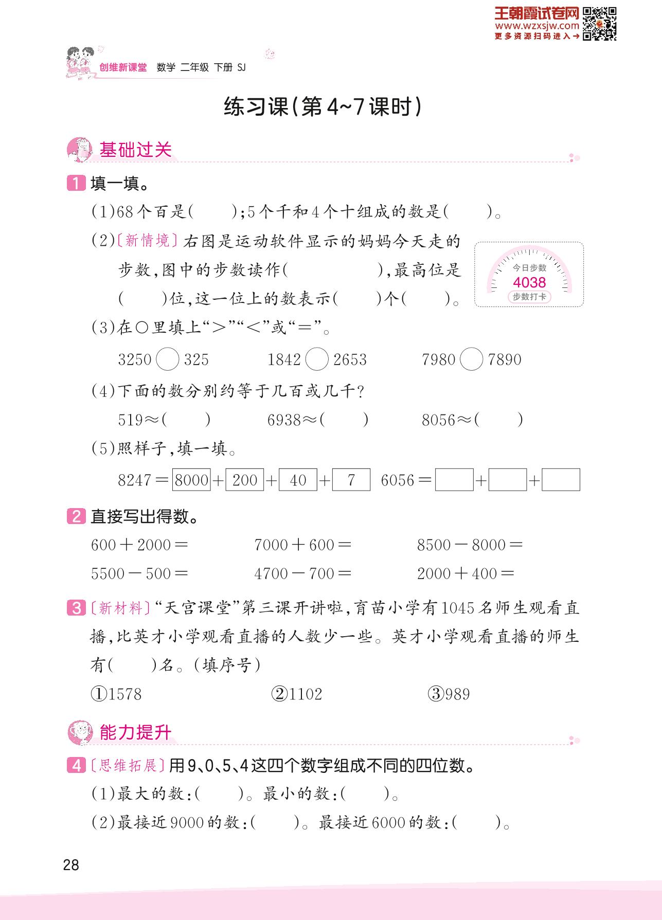 2023下册二年级数学苏教版 四 认识万以内的数——练习课(第4~7课时)